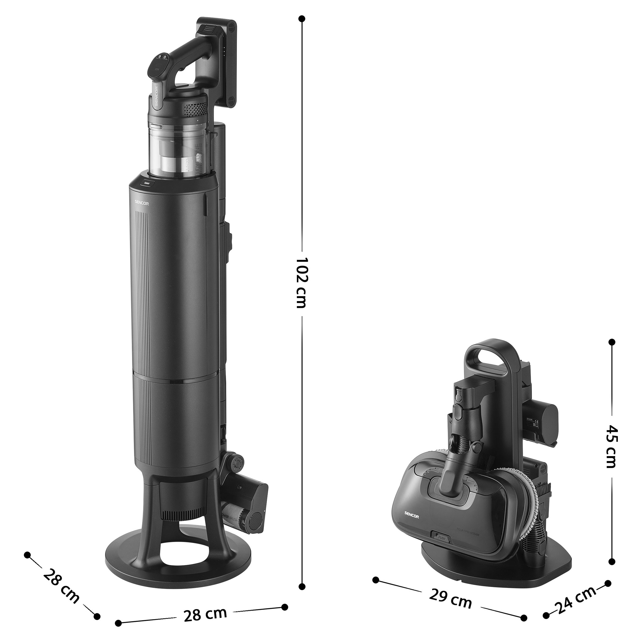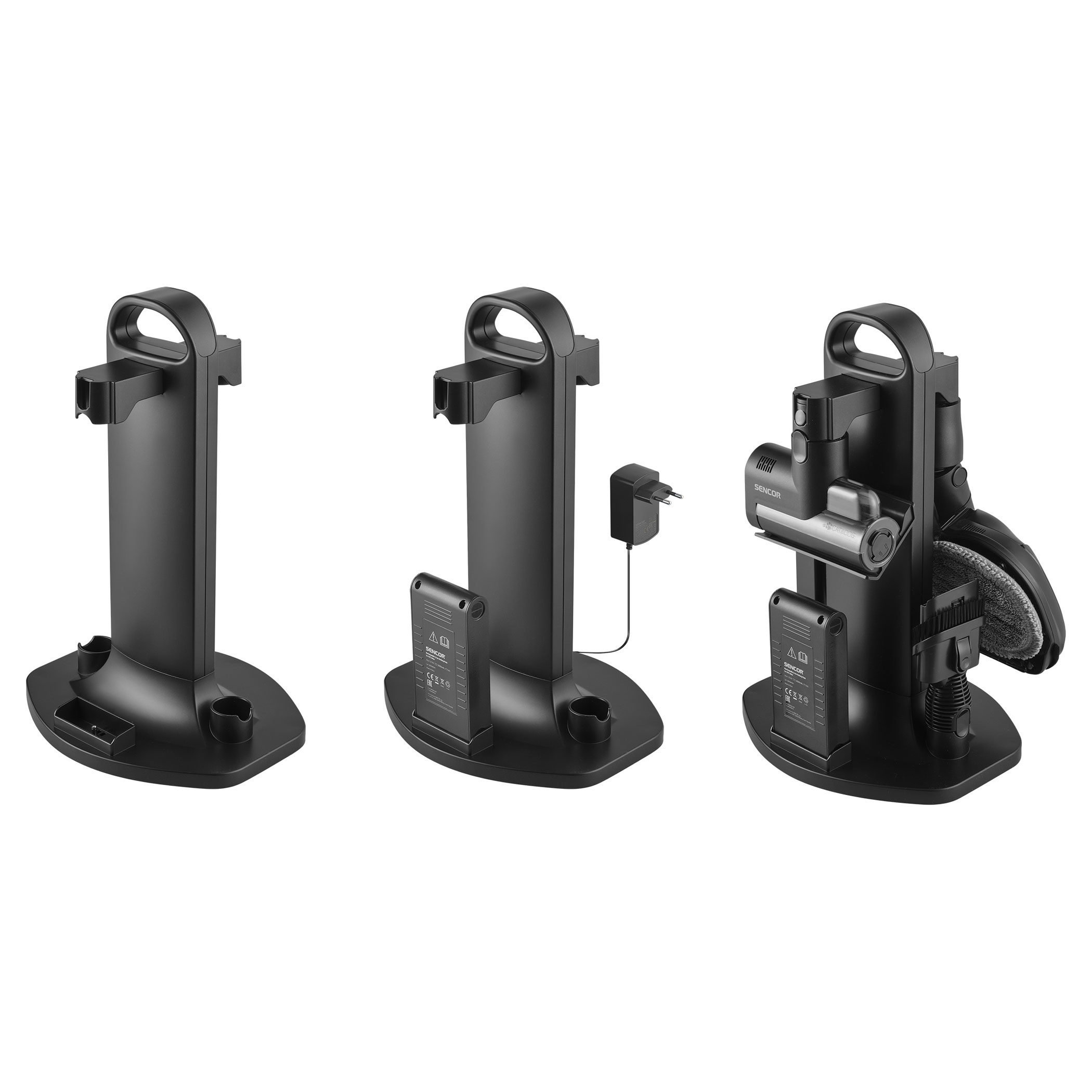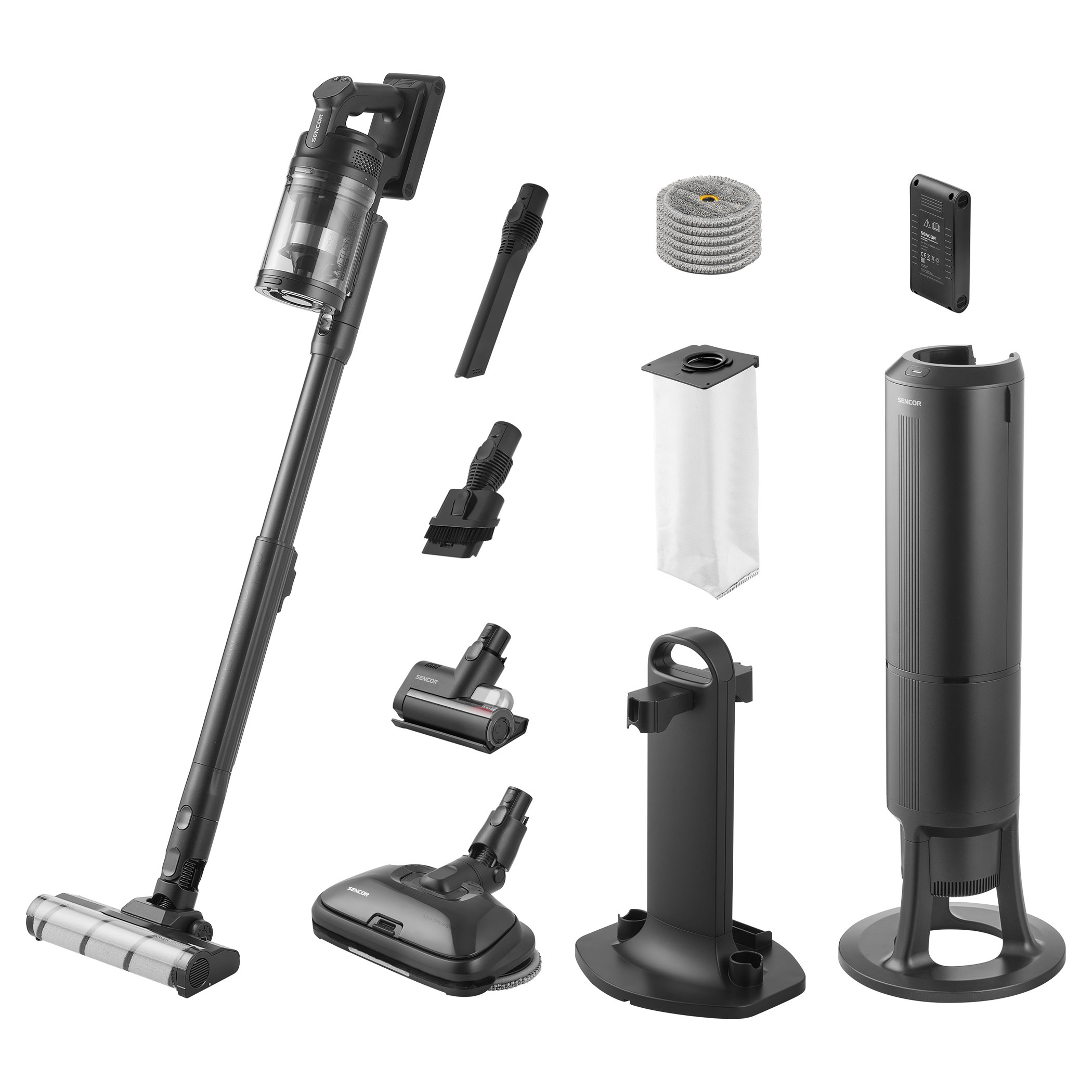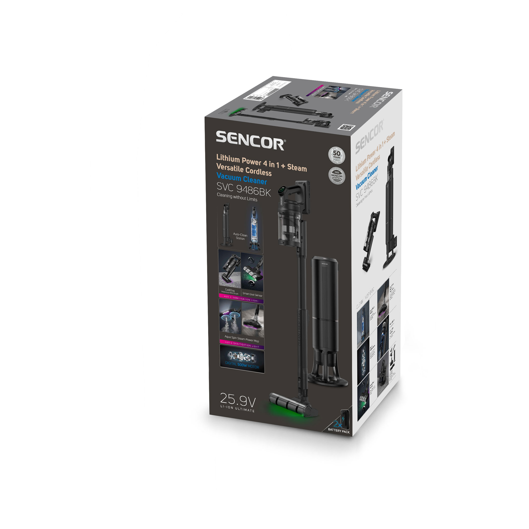 Az SVC 9486BK 500 W-os digitális motorral és HEPA H13 szűrővel ellátott multicyklon rendszerrel biztosítja a magas és tartós szívóerőt. A Smart Dust Sensor automatikusan szabályozza a teljesítményt a szennyezettség mértéke alapján, optimalizálva a fogyasztást és növelve az üzemidőt. A csomag két darab Li-ion akkumulátort tartalmaz (3000 mAh, 25,9 V), amelyek akár