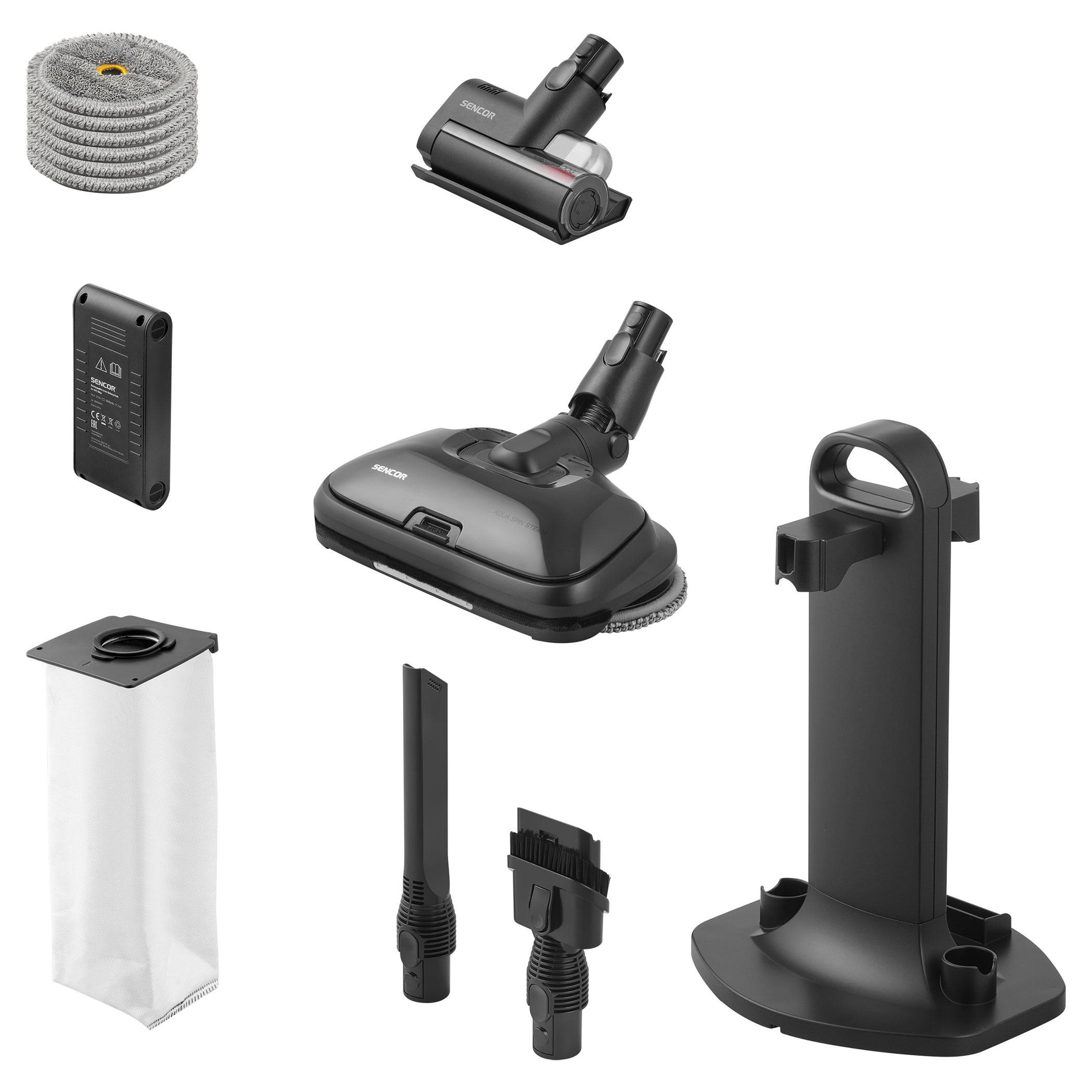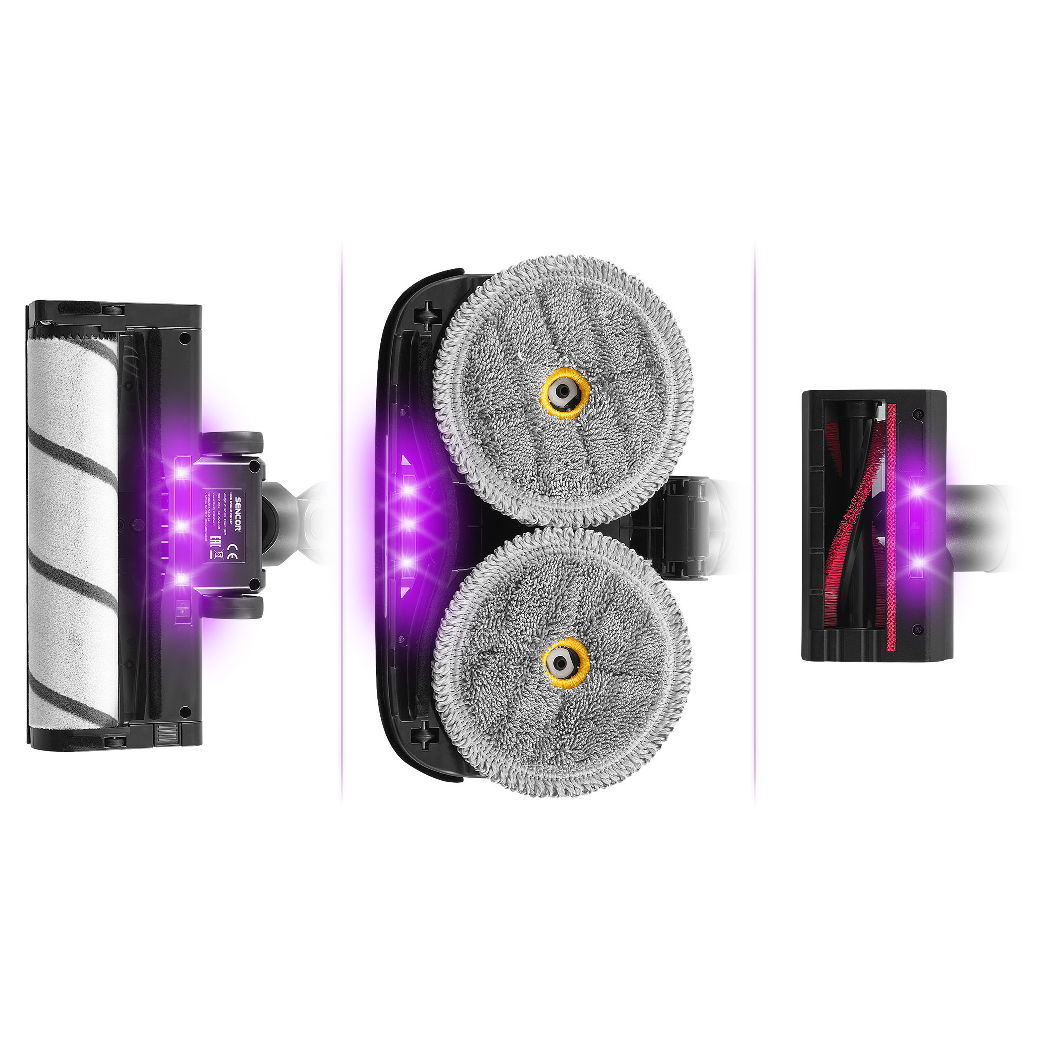 110 perc üzemidőt biztosítanak. A motoros padlófej MicroDust Vision LED világítással és UV-C sterilizációval láthatóvá teszi a port és fertőtleníti a felületeket. Az Aqua Spin Steam fej egyszerre porszívóz, felmos és gőzzel tisztít; a két forgó mop eltávolítja a szennyeződéseket, a forró gőz vegyszerek nélkül tisztít, az UV-C fény pedig segít elpusztítani a mikroorganizmusokat. A Cat & Dog UV-C motoros kefe mélytisztítja a kárpitot és matracokat, eltávolítva a szőrt, baktériumokat és atkákat.
