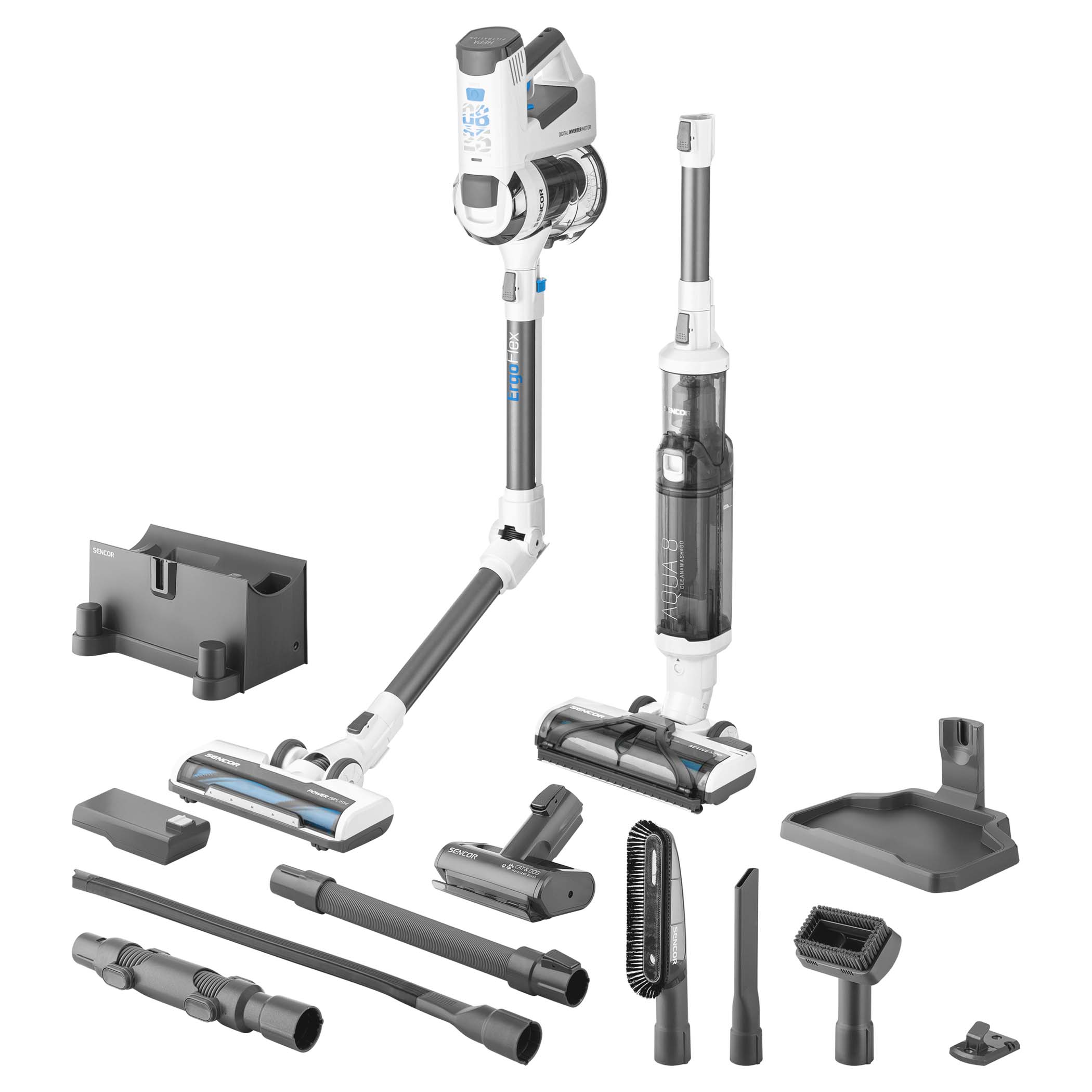 A Sencor SVC 0825WH all-in-one porszívó rendszert egy rendkívül nagy teljesítményű, korszerű 380 W-os digitális BLDC motor hajtja. Ez egy két porszívós készlet, amit számos igen hasznos tartozék egészít ki. Az Aqua8 rendszernek köszönhetően nedves és száraz porszívózásra is egyaránt használható. Az állattartók értékelni fogják a Cat & Dog Mini kézi egység motoros keféjét, amellyel a kárpitozott bútorokon játékosan távolíthatod el a szőrszállakat. A porszívó tökéletes irányíthatóságot és manőverezhetőséget kínál a 180 ° -ban forgó fejnek és a kis súlynak köszönhetően.