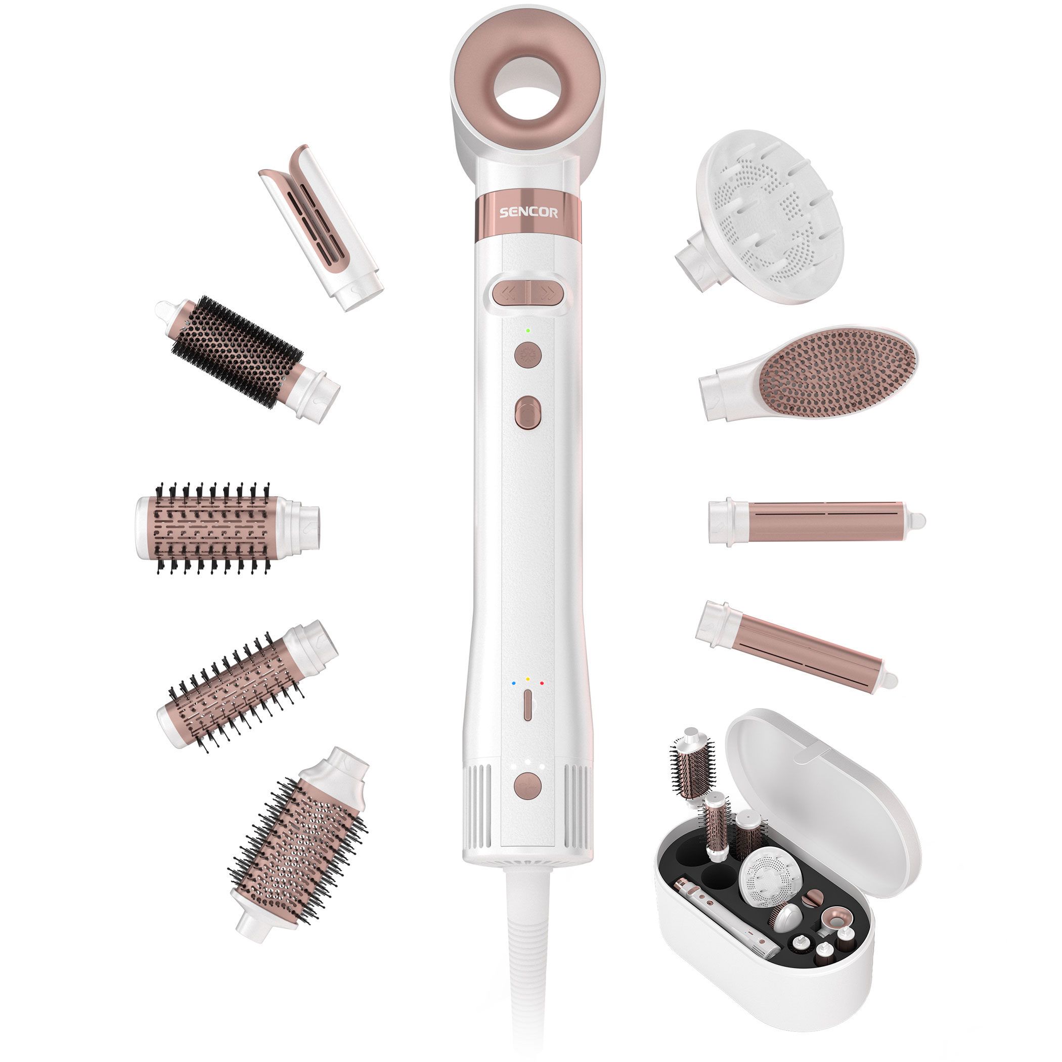 A Sencor SHS 9200RS Artemiss automatikus forgó meleglevegős hajformázó modern technológiával és elegáns kialakítással kínál professzionális hajápolási élményt. A készülék a Coanda-hatás és az automatikus forgó funkció kombinációjával segít természetes hullámok, volumen és sima frizura kialakításában, miközben gyors és kíméletes hajszárítást biztosít.