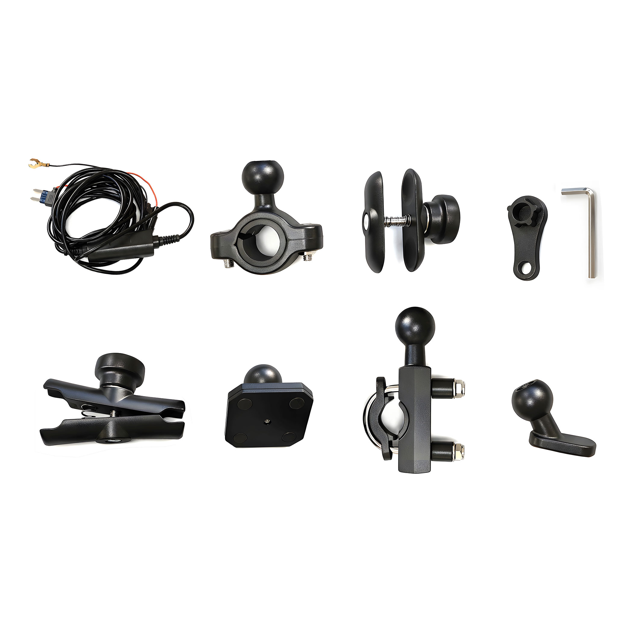 A csomag többféle rögzítési megoldást tartalmaz, így a kijelző könnyen felszerelhető különböző motorkerékpárokra.