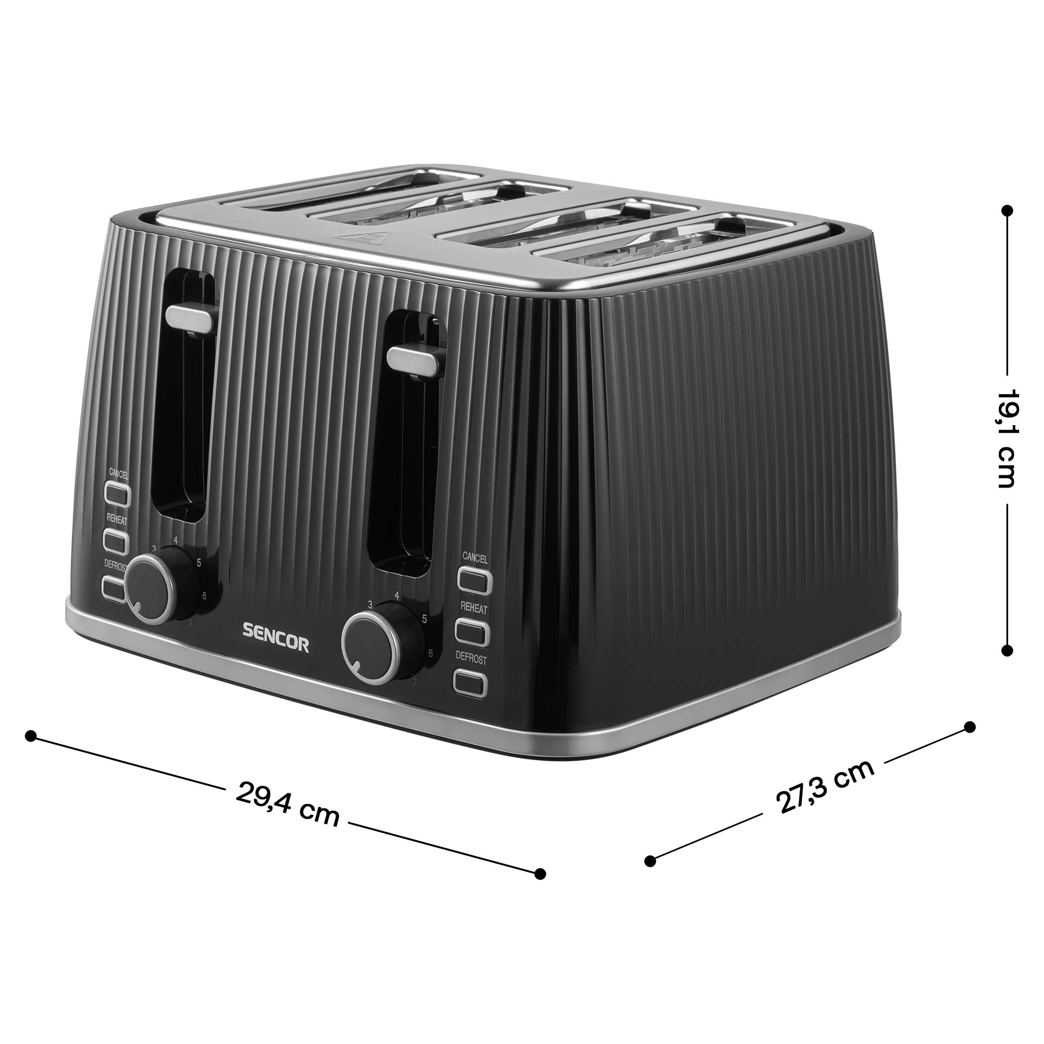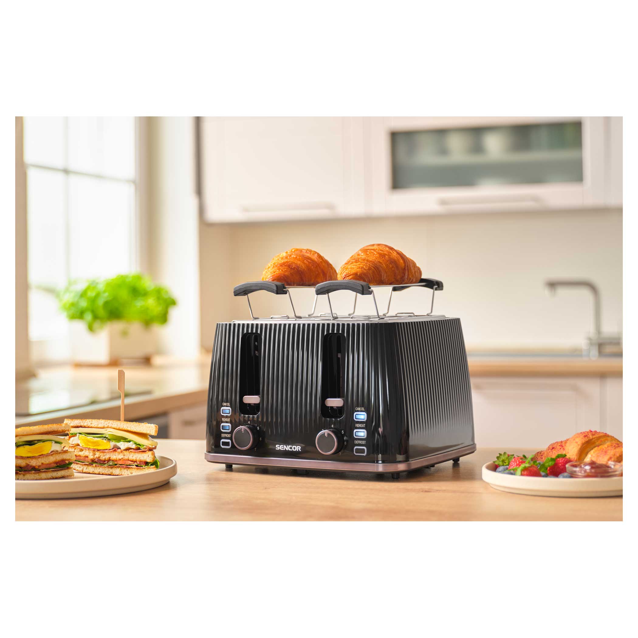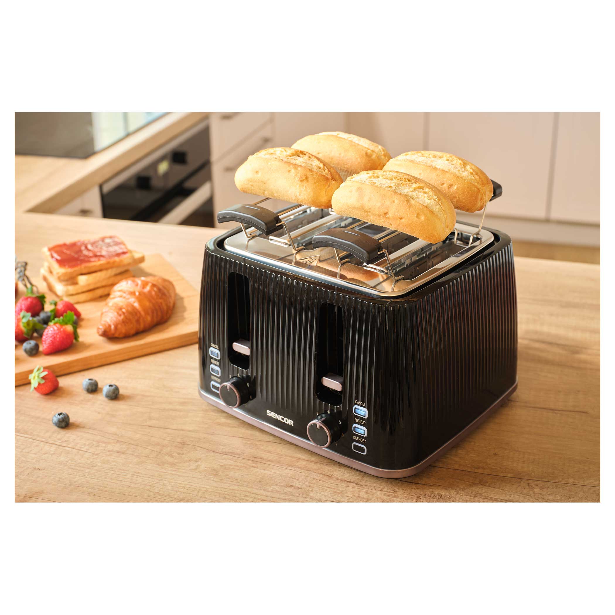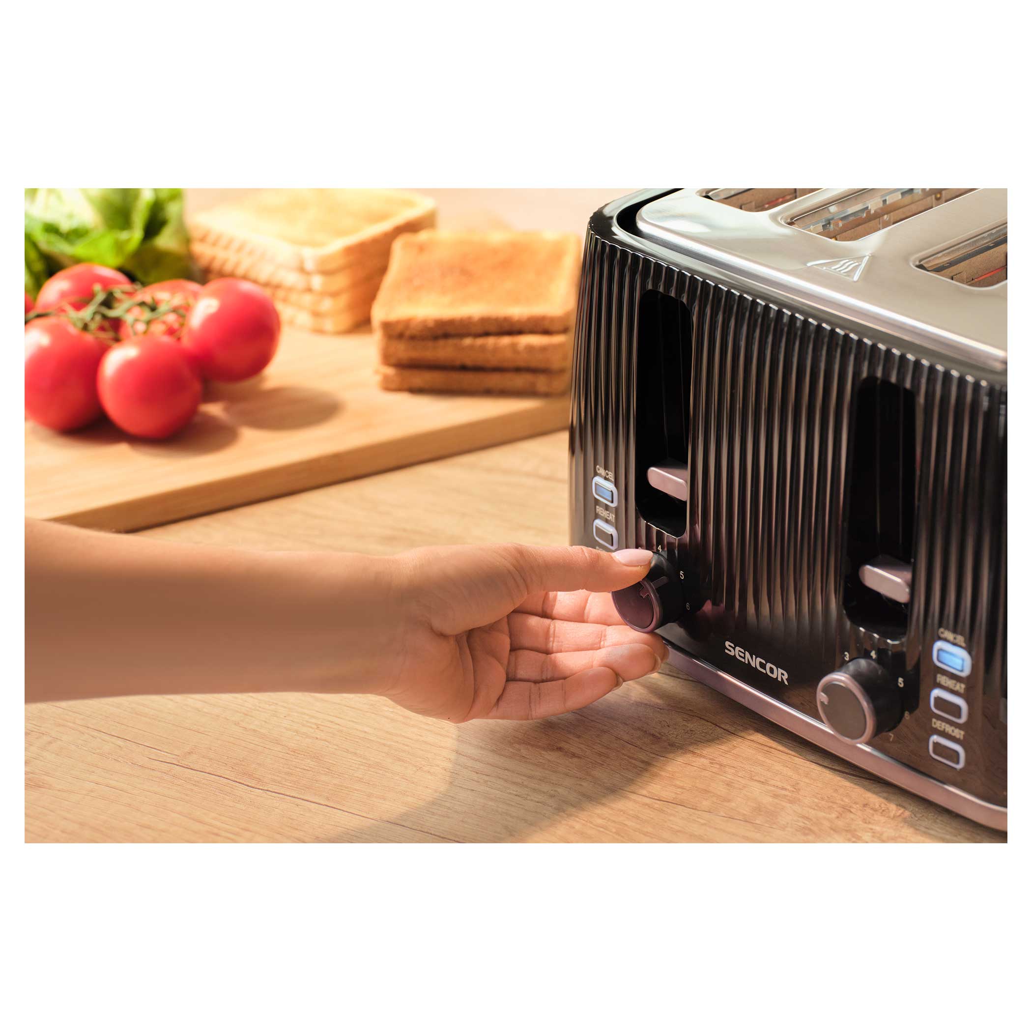A Sencor STS 7541BK kenyérpirító segítségével a nap legfontosabb étkezéséhez járulhatsz hozzá saját ízlésednek megfelelő pirítósokkal. Egyszerre négy szelet kenyér készíthető, a pirítás intenzitását 7 fokozatban állíthatod be. Készíts friss zsemlét a péksütemény melegítő rács segítségével. Három további extra funkcióval rendelkezik, ilyen az ismételt melegítés/újra melegítés (fényjelzéssel), a melegítés azonnali megszakadása a beállított idő vége előtt és fagyasztott kenyér pirítása/kiolvasztása (fényjelzéssel).