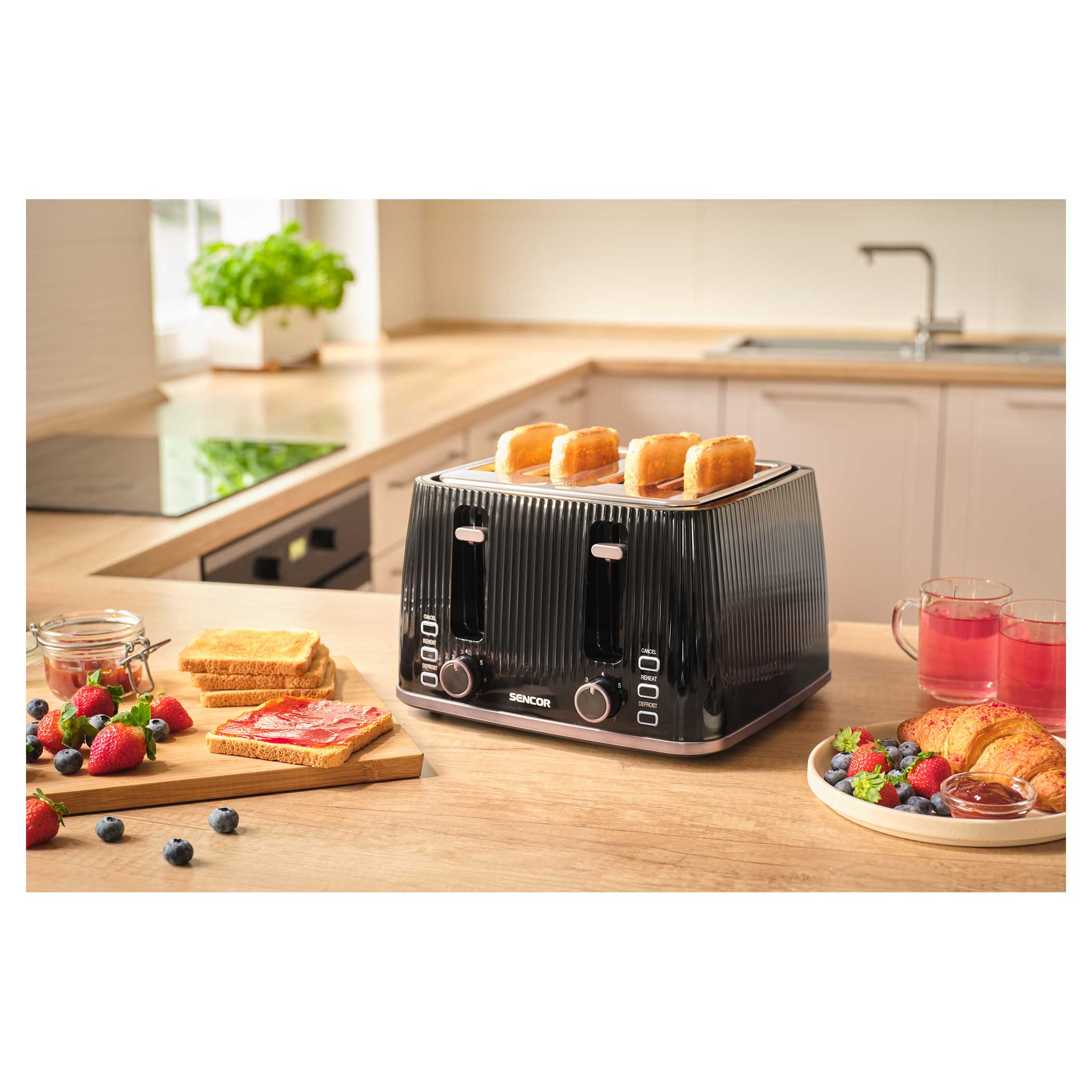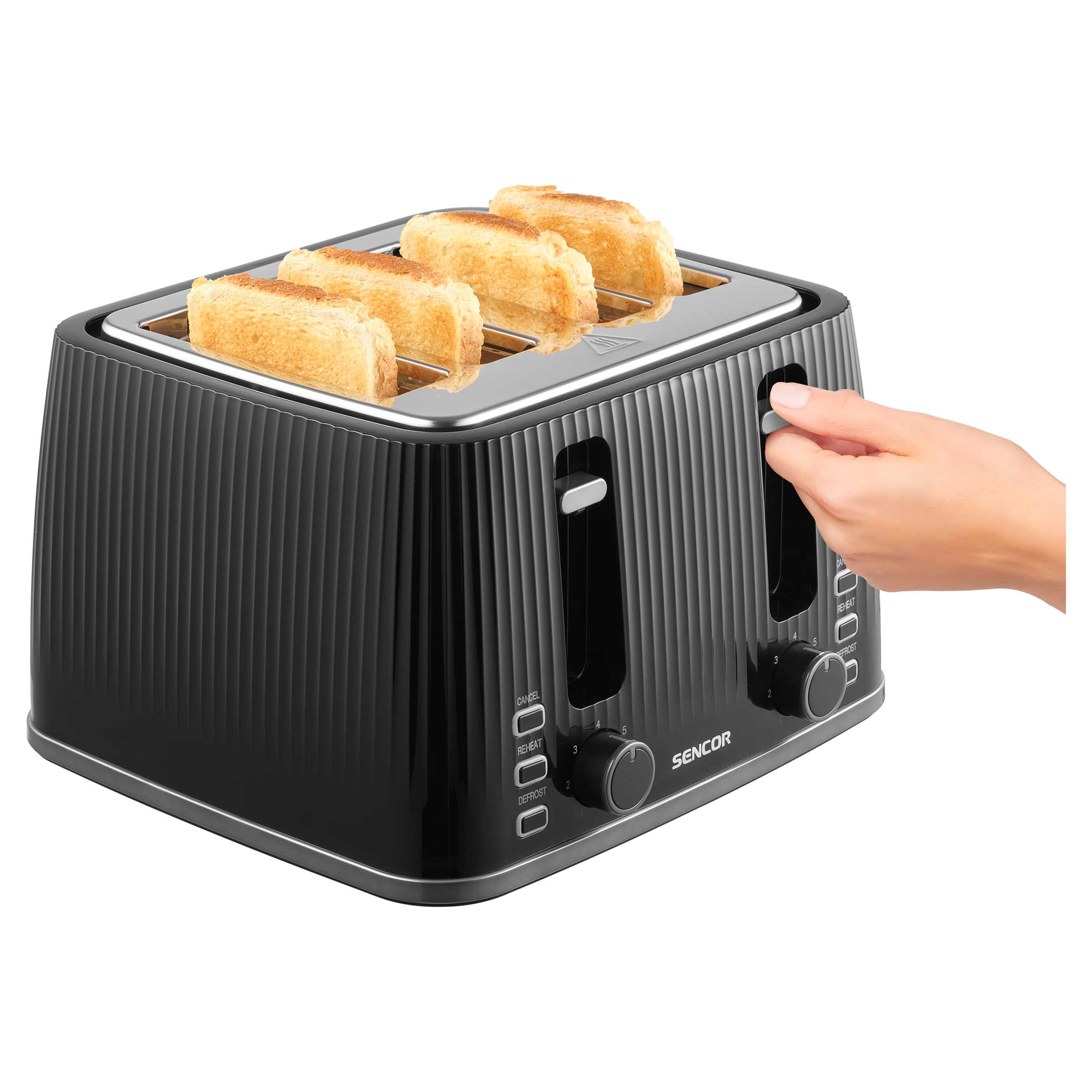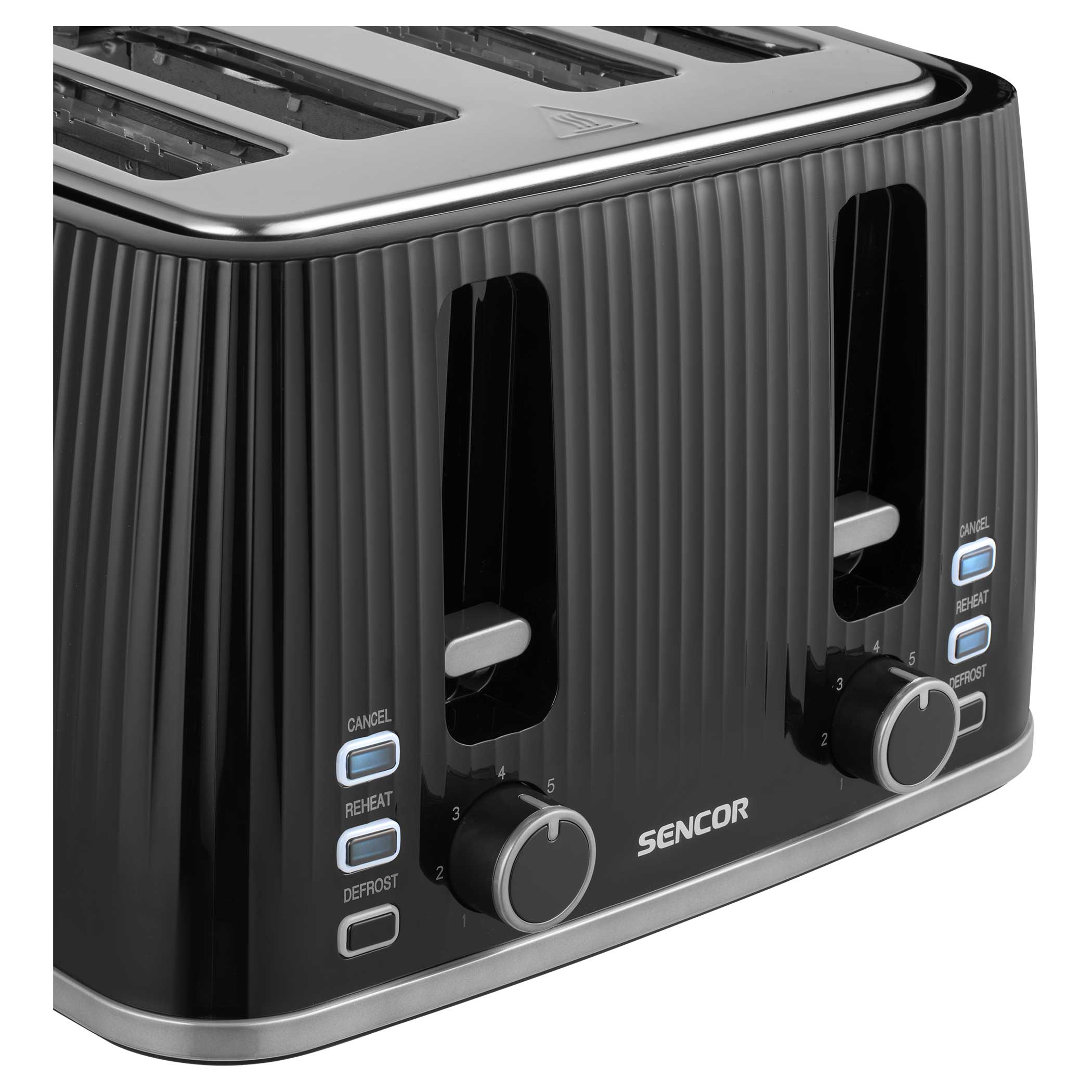 A Sencor STS 7541BK kenyérpirító segítségével a nap legfontosabb étkezéséhez járulhatsz hozzá saját ízlésednek megfelelő pirítósokkal. Egyszerre négy szelet kenyér készíthető, a pirítás intenzitását 7 fokozatban állíthatod be. Készíts friss zsemlét a péksütemény melegítő rács segítségével. Három további extra funkcióval rendelkezik, ilyen az ismételt melegítés/újra melegítés (fényjelzéssel), a melegítés azonnali megszakadása a beállított idő vége előtt és fagyasztott kenyér pirítása/kiolvasztása (fényjelzéssel).