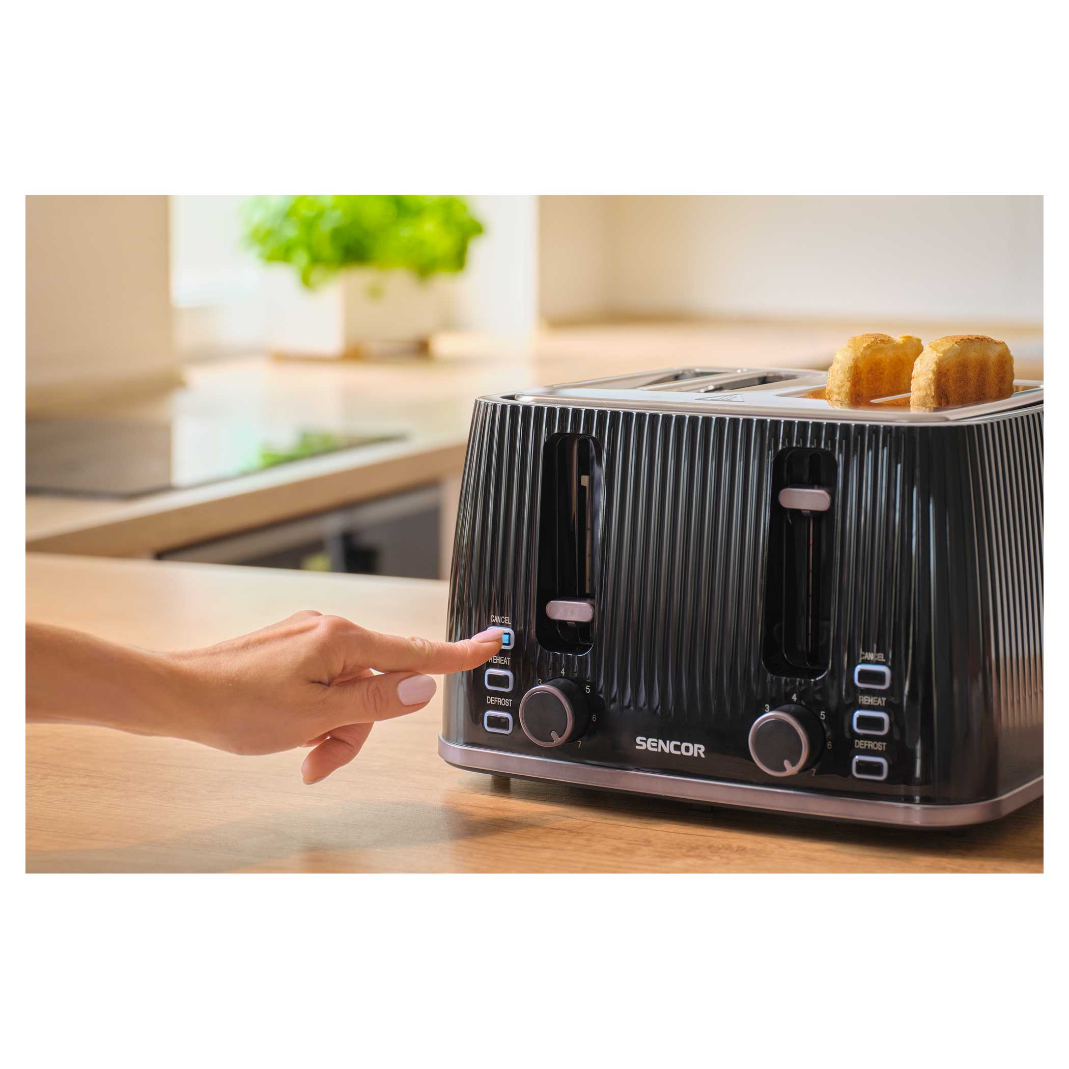 A Sencor STS 7541BK kenyérpirító praktikus funkciókkal rendelkezik, mint például a kenyér automatikus középre történő igazítása, amely lehetővé teszi a kenyér vastagságának kiválasztását. Ezenkívül képes automatikusan kiolvasztani, majd egyetlen folyamattal befejezni a fagyasztott péksütemények sütését. Praktikus a High Lift funkció, a pirítókosár úgynevezett magas emelése, amely biztosítja a még kisebb kenyérszeletek pirítását és egyben megkönnyíti a maradék részek eltávolítását.