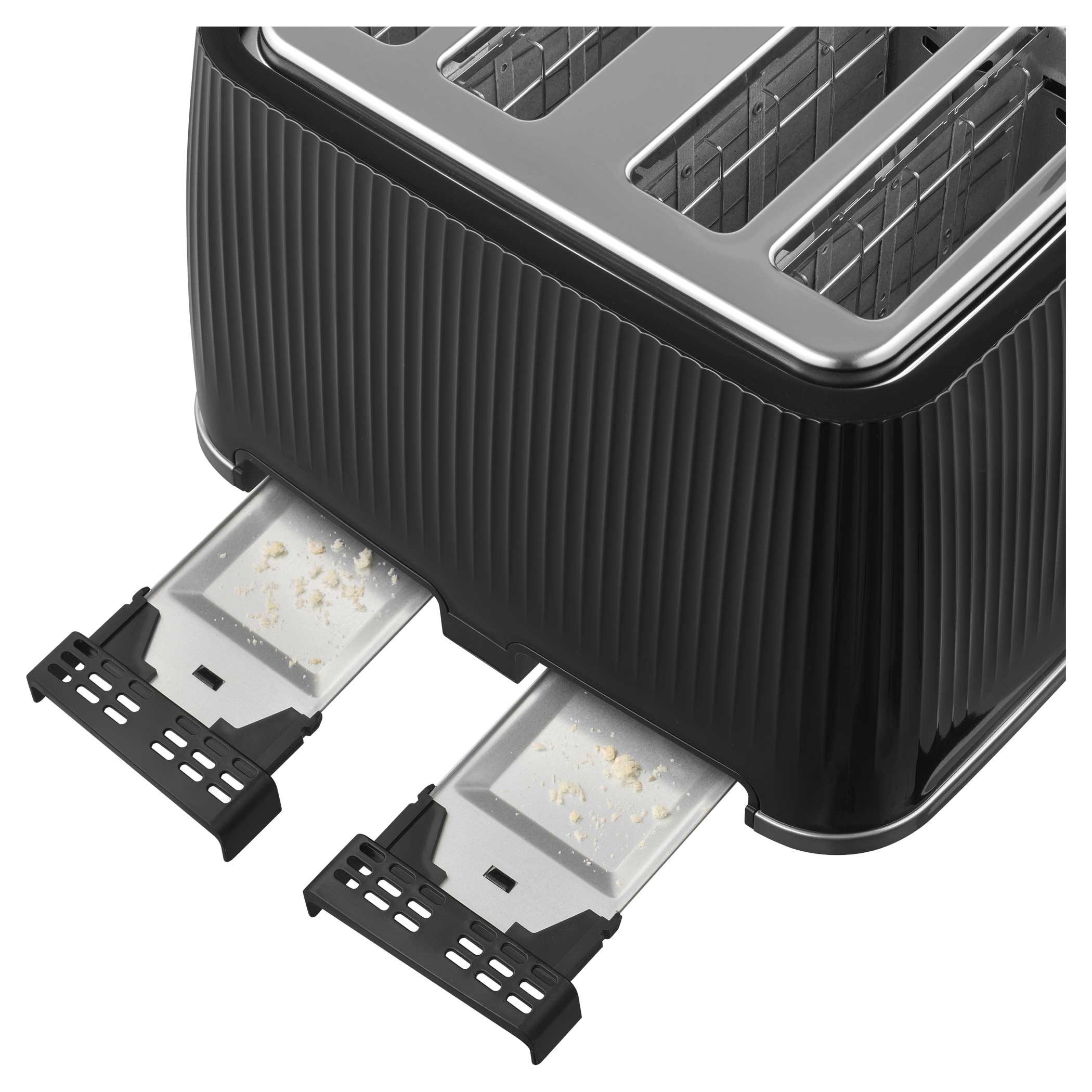 A 4 szeletes kialakítású kenyérpirító, beépített morzsatálcával rendelkezik. Az a kis tálca a készülék alján került elhelyezésre, mely felfogja a pirítási folyamatok alkalmával keletkező morzsákat. A morzsatálca egyszerűen kihúzható a készülékből és máris tisztává varázsolhatod. A nemesacél design egyszerű nedves ruhával tisztítható.