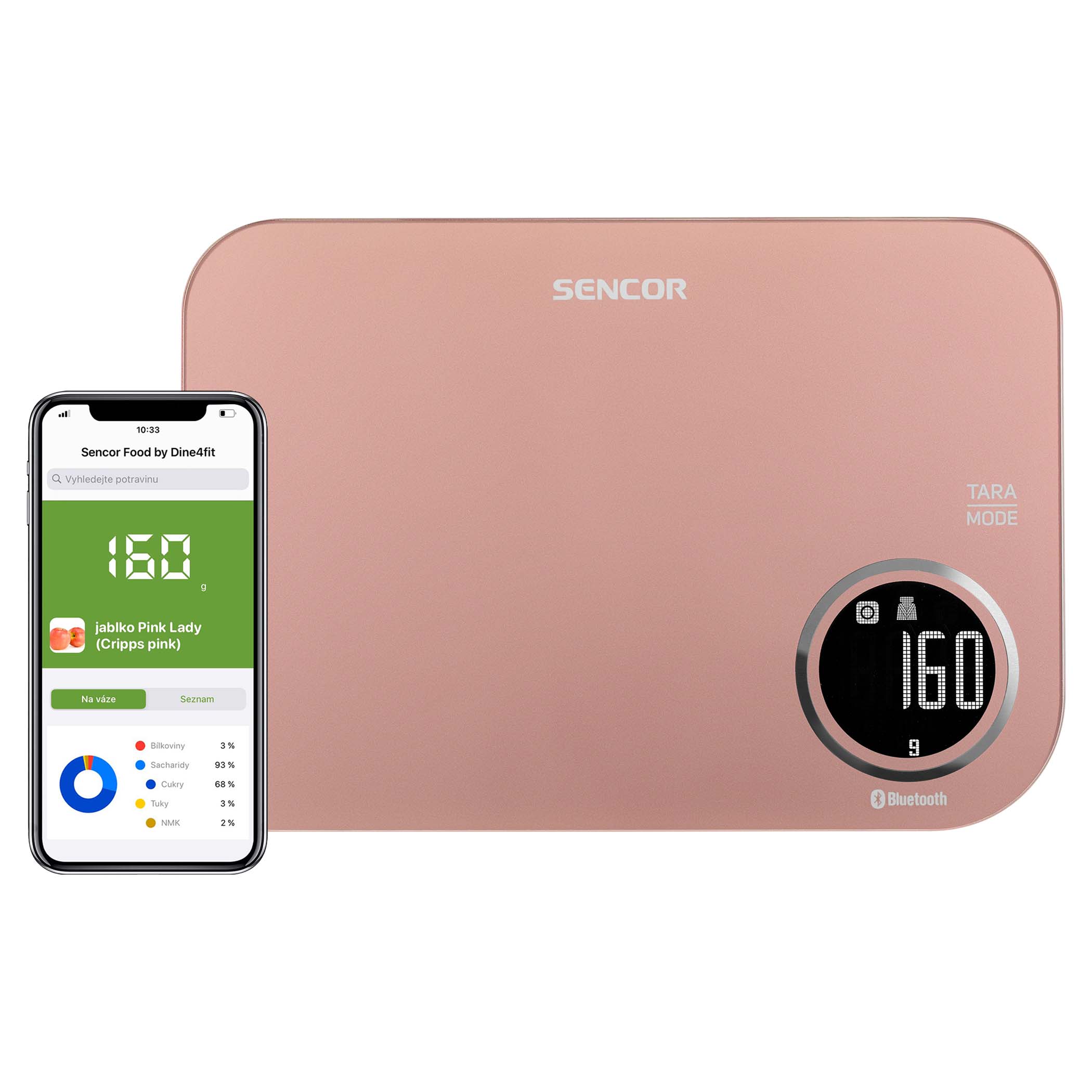 A mérleg olyan széles élelmiszeradatbázist kínál, amelyet máshol egyszerűen nem találhat meg. Több mint 400 000 adat van elrejtve benne. Rendszeresen frissítik, és tökéletes áttekintést nyújt a tápértékekről. Az ingyenesen letölthető Sencor FOOD alkalmazáshoz kapcsolódik, amelyben a széles körben is használt Kalóriatáblázat (Dine4FIT) szerzői vettek részt. Nyilvántartást vezethet a kimért élelmiszerekről a kalóriatáblázatban, és hosszú időn keresztül figyelemmel kísérheti étkezési szokásait. A mérleg Bluetooth-on keresztül kommunikál az alkalmazással, és automatikusan kapcsolódik az okostelefonnal.