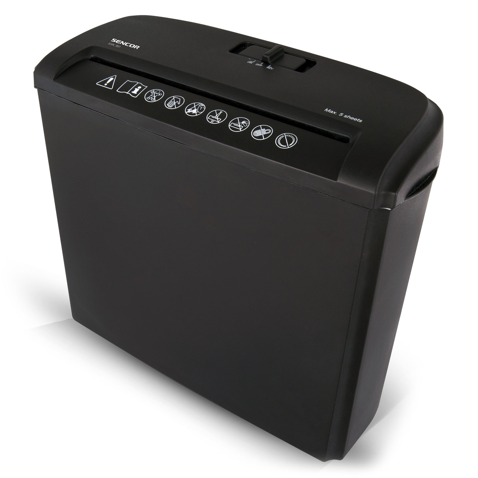 A Sencor SSK 151 iratmegsemmisítő hosszanti vágással egyszerre akár 5 papír megsemmisítésére képes 2,5 m/min sebességgel. A bemeneti nyílás szélessége 218 mm, amely elegendő az A4-es papírlapokhoz. A megsemmisített papír végül egy 7 l űrtartalmú iratkosárba kerül. Hossz menti vágási elv alkalmazása mellett az aprított csíkok mérete 7 mm nagyságú. Ha elakadna a papír, az iratmegsemmisítő irányváltoztató funkciója segít. A papír csatlakoztatásakor az aprító automatikusan bekapcsol, köszönhetően az érzékeny mikrokapcsolónak, így nem kell nyomni semmilyen gombot vagy kapcsolót. DIN P-1 és DIN P-2 védelmi besorolási szint.