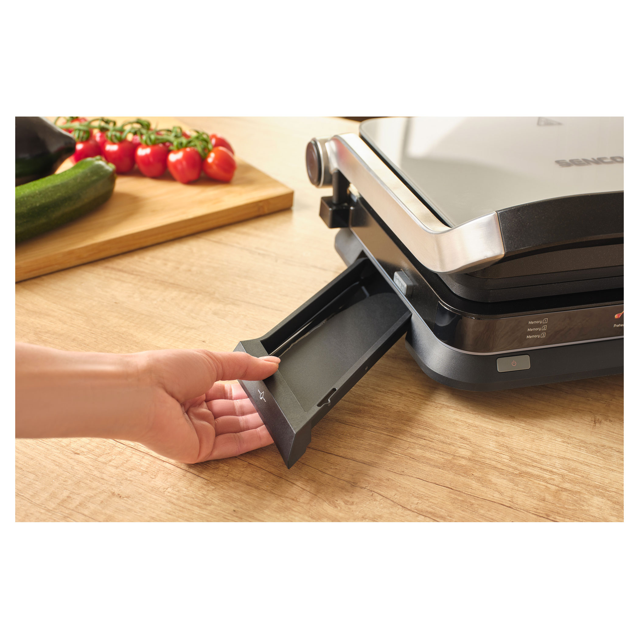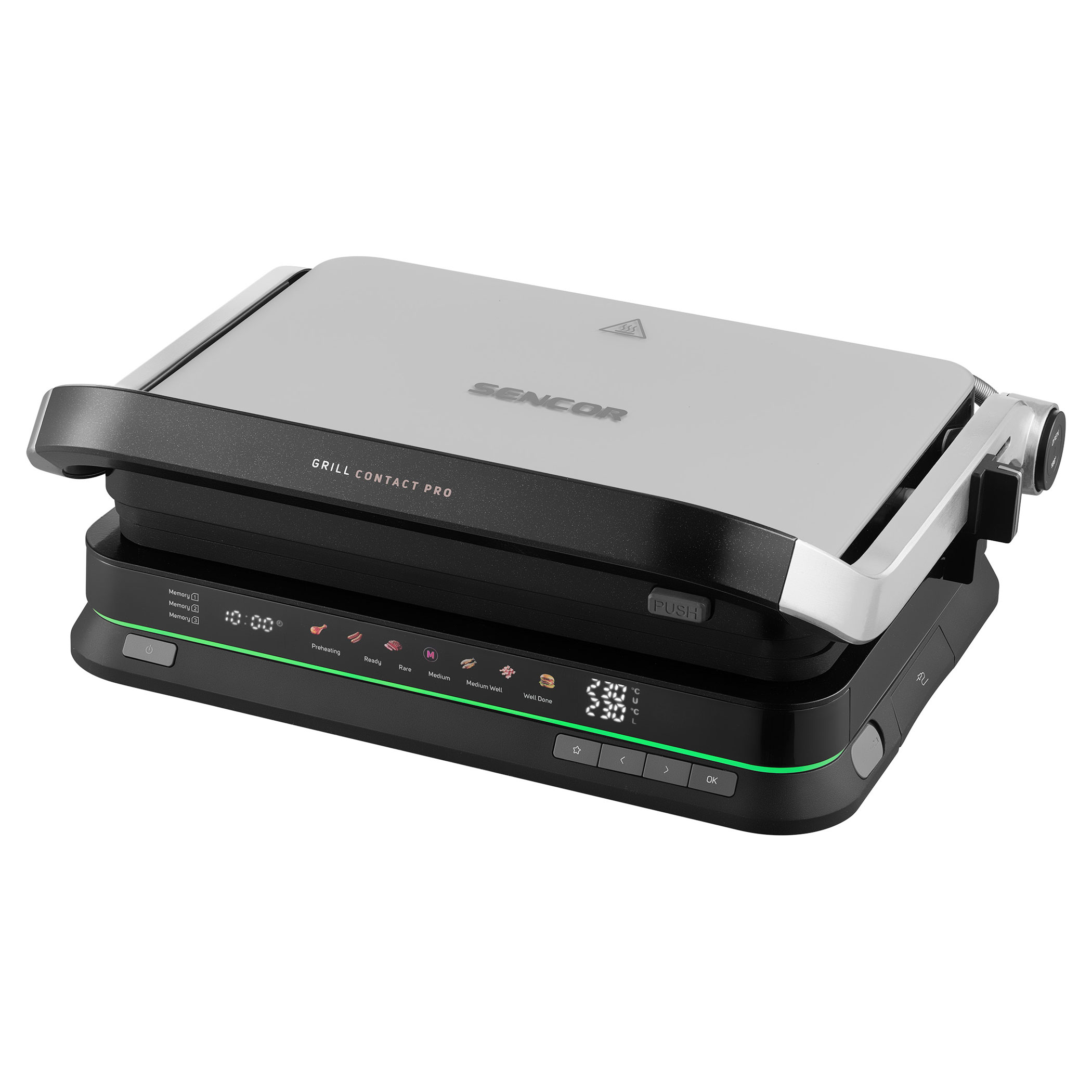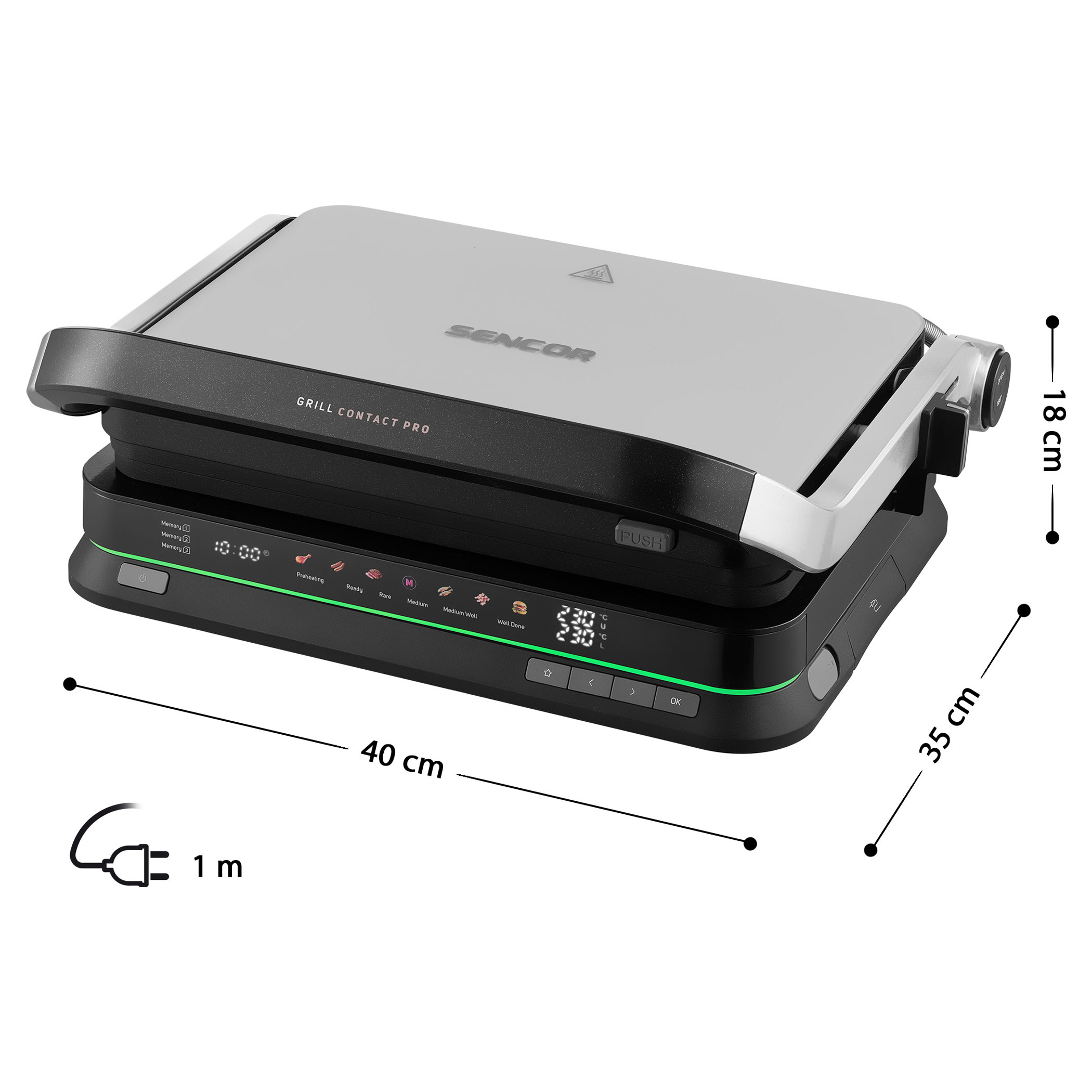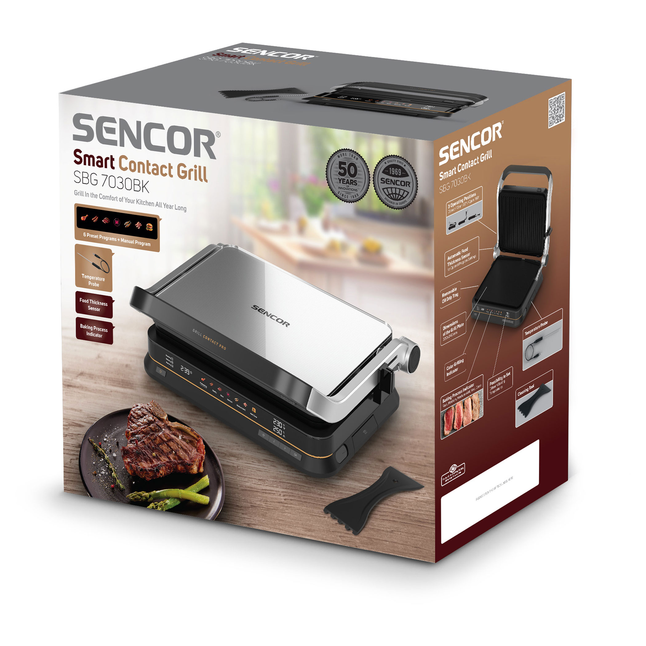 A Sencor SBG 7030BK kontaktgrill lehetővé teszi szaftos húsok, hamburgerek, halak, grillezett zöldségek és más ételek egyszerű elkészítését. Az intelligens szenzor felismeri az étel vastagságát és automatikusan beállítja a grillezési időt.