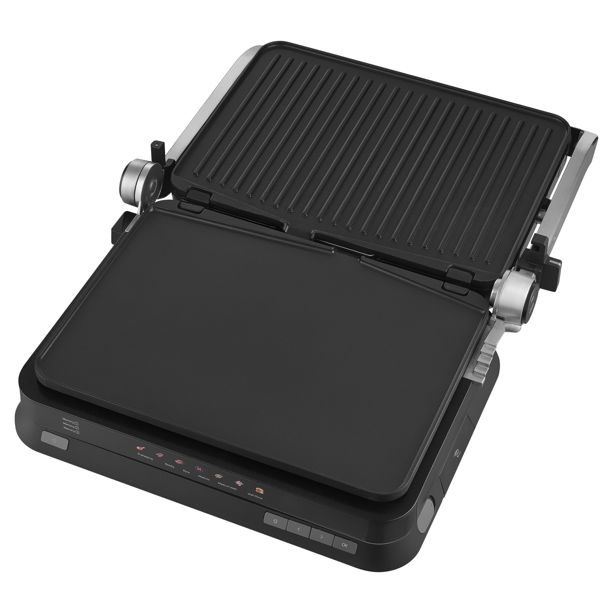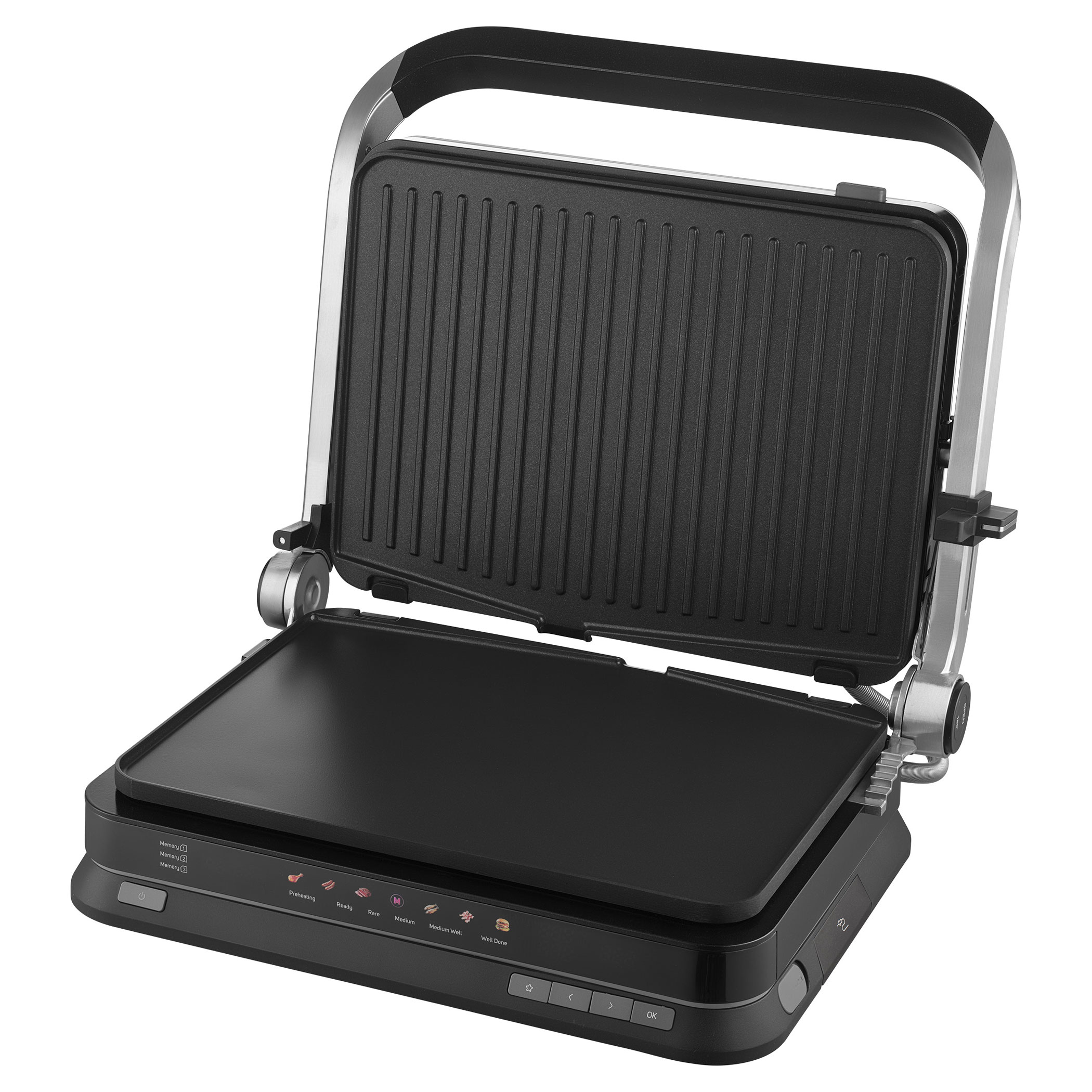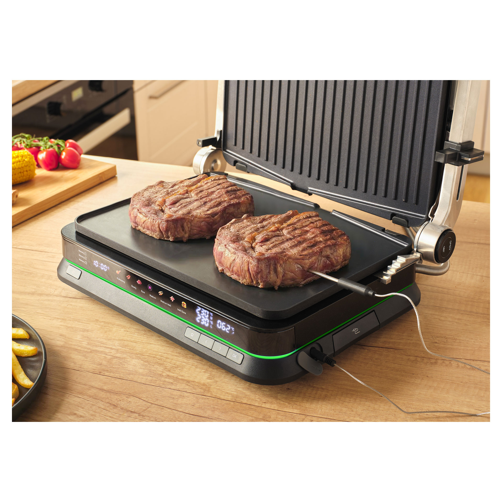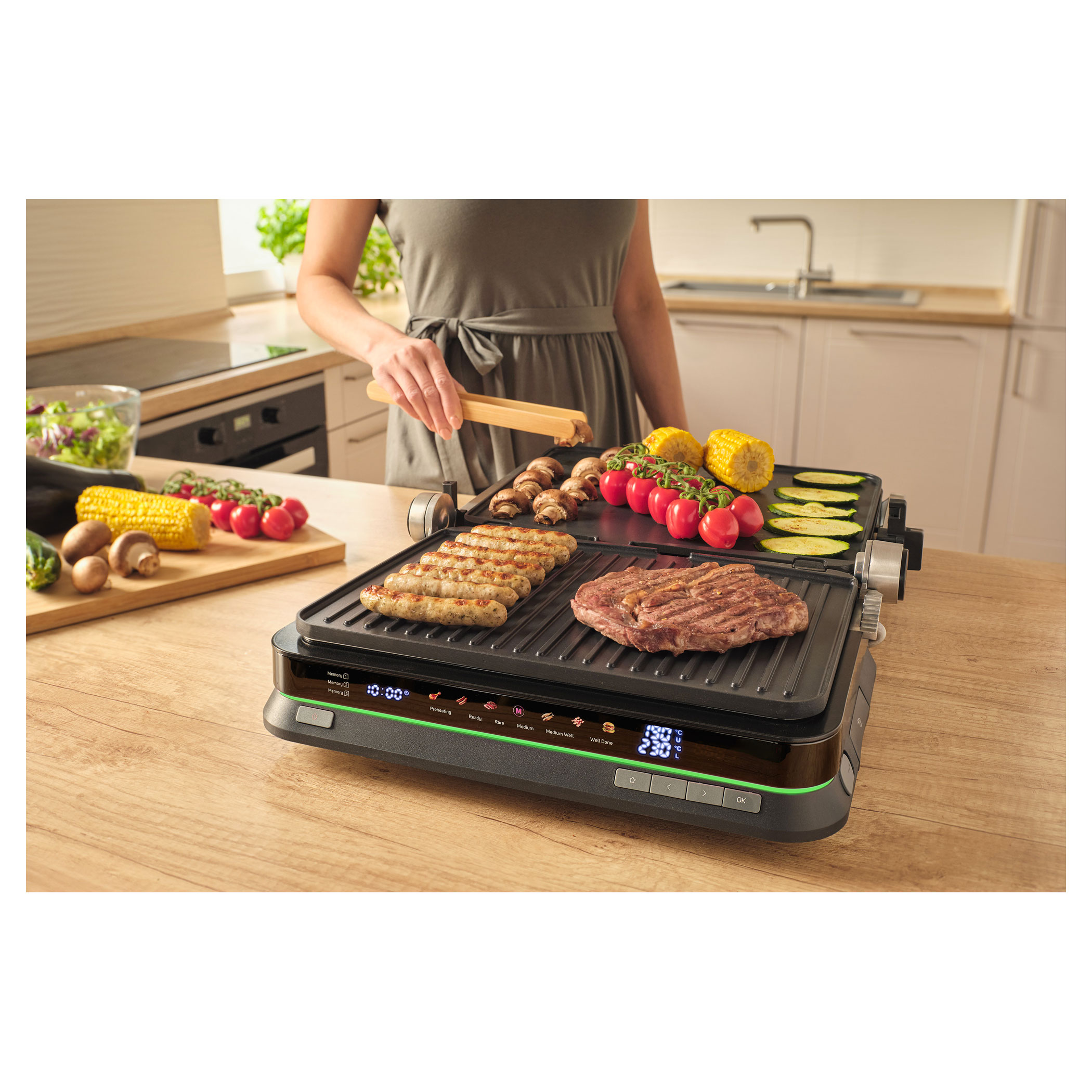 A Sencor SBG 7030BK kontaktgrill lehetővé teszi szaftos húsok, hamburgerek, halak, grillezett zöldségek és más ételek egyszerű elkészítését. Az intelligens szenzor felismeri az étel vastagságát és automatikusan beállítja a grillezési időt.