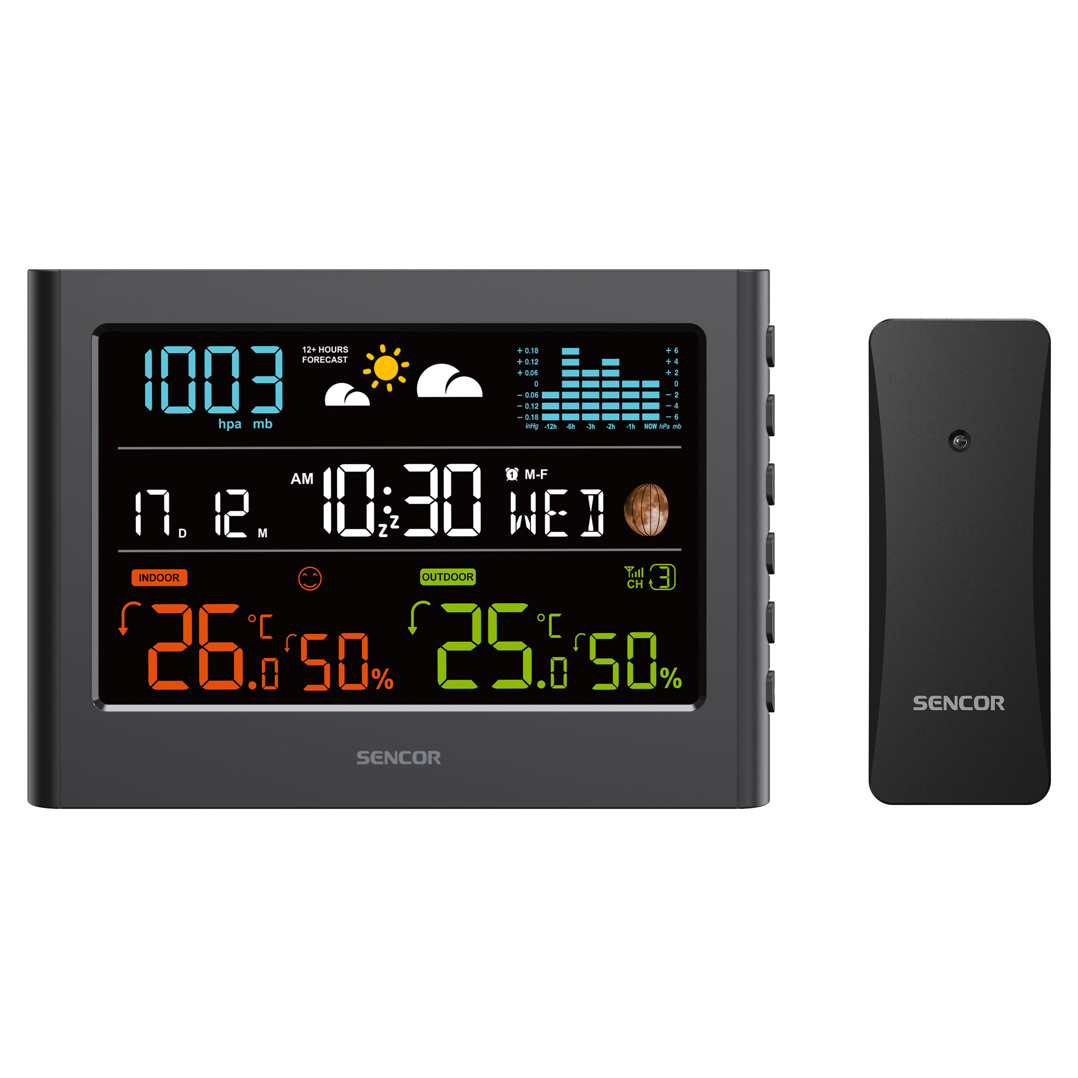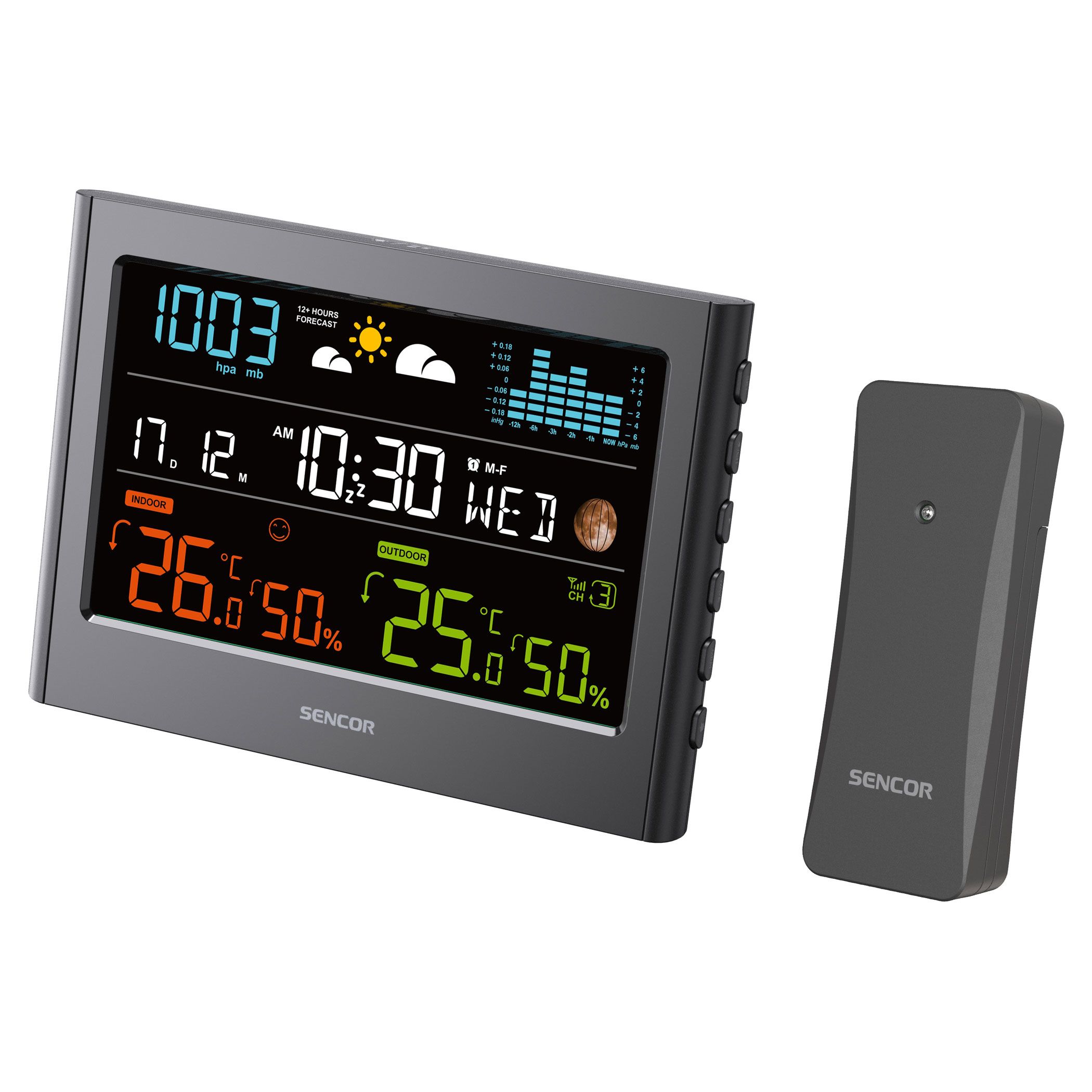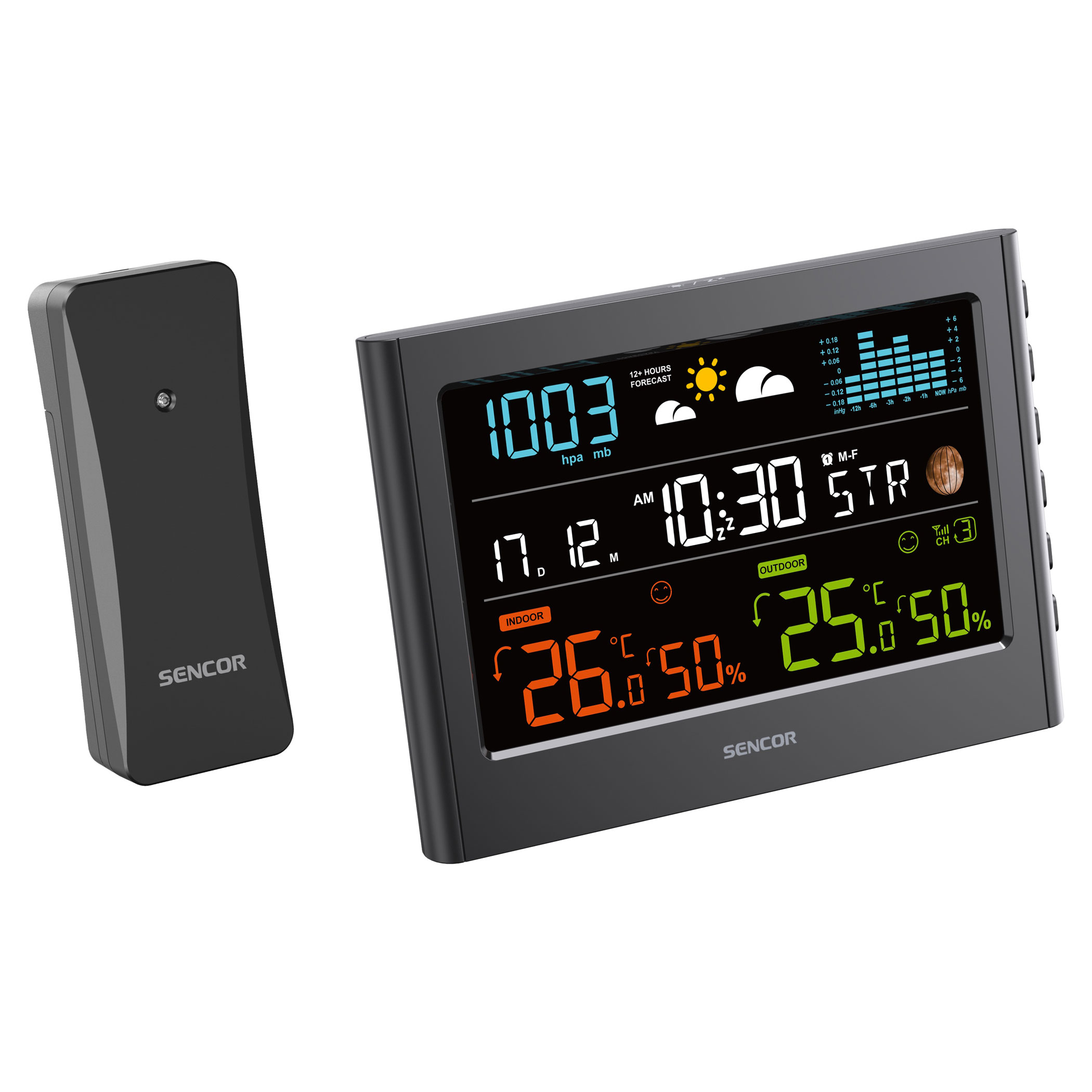 A színes kijelzővel rendelkező meteorológiai állomás 12–24 órás időjárás-előrejelzést kínál. Vezeték nélküli érzékelője méri a hőmérsékletet és a páratartalmat. Kövesse a légnyomást és a nyomásváltozás oszlopdiagramját. Rádióvezérelt órával rendelkezik DST funkcióval, valamint az mért adatok automatikus váltásával.