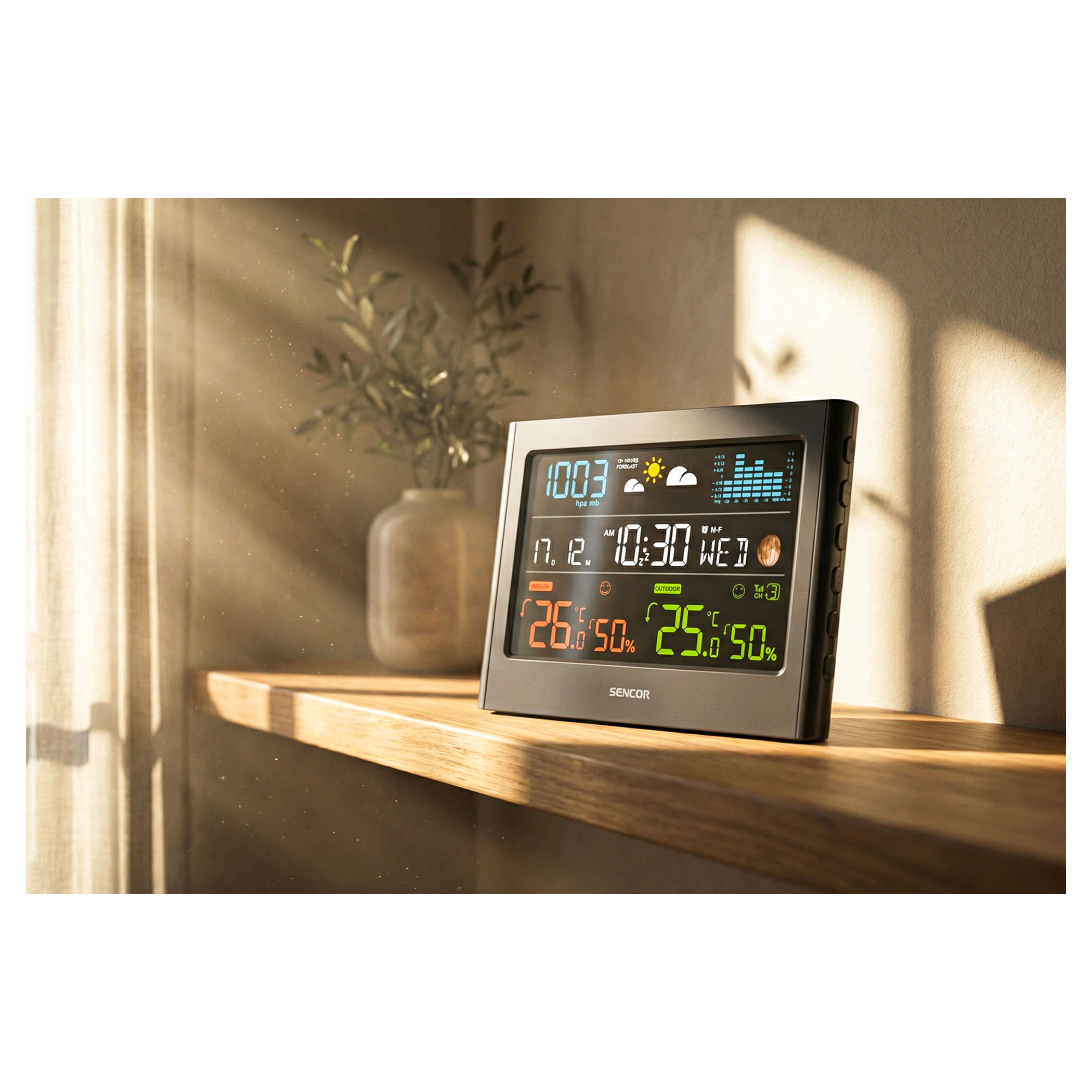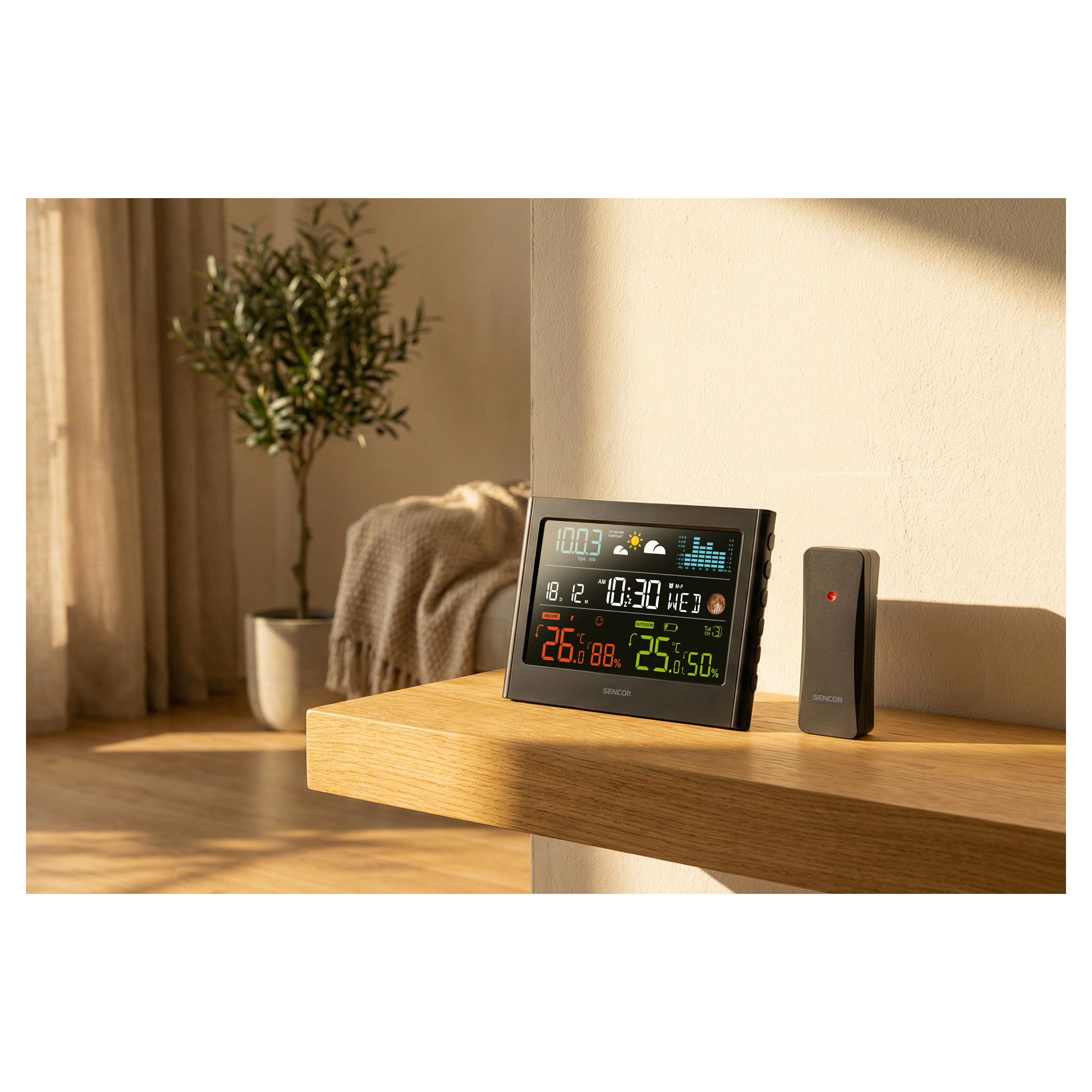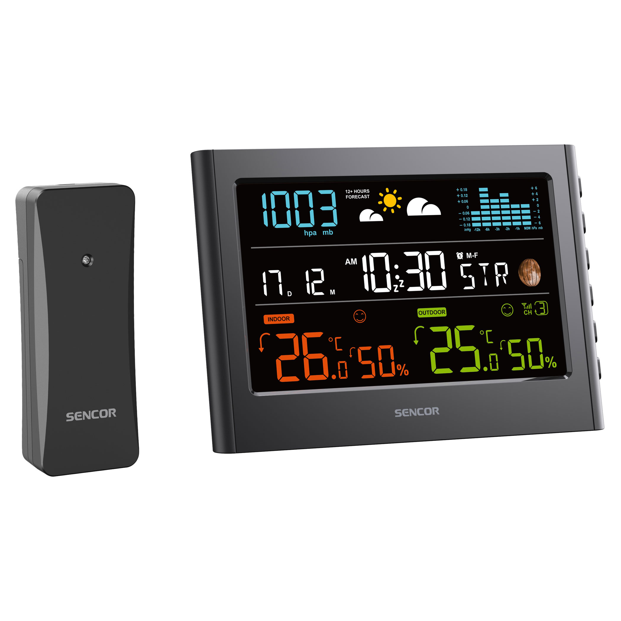 A színes kijelzővel rendelkező meteorológiai állomás 12–24 órás időjárás-előrejelzést kínál. Vezeték nélküli érzékelője méri a hőmérsékletet és a páratartalmat. Kövesse a légnyomást és a nyomásváltozás oszlopdiagramját. Rádióvezérelt órával rendelkezik DST funkcióval, valamint az mért adatok automatikus váltásával.