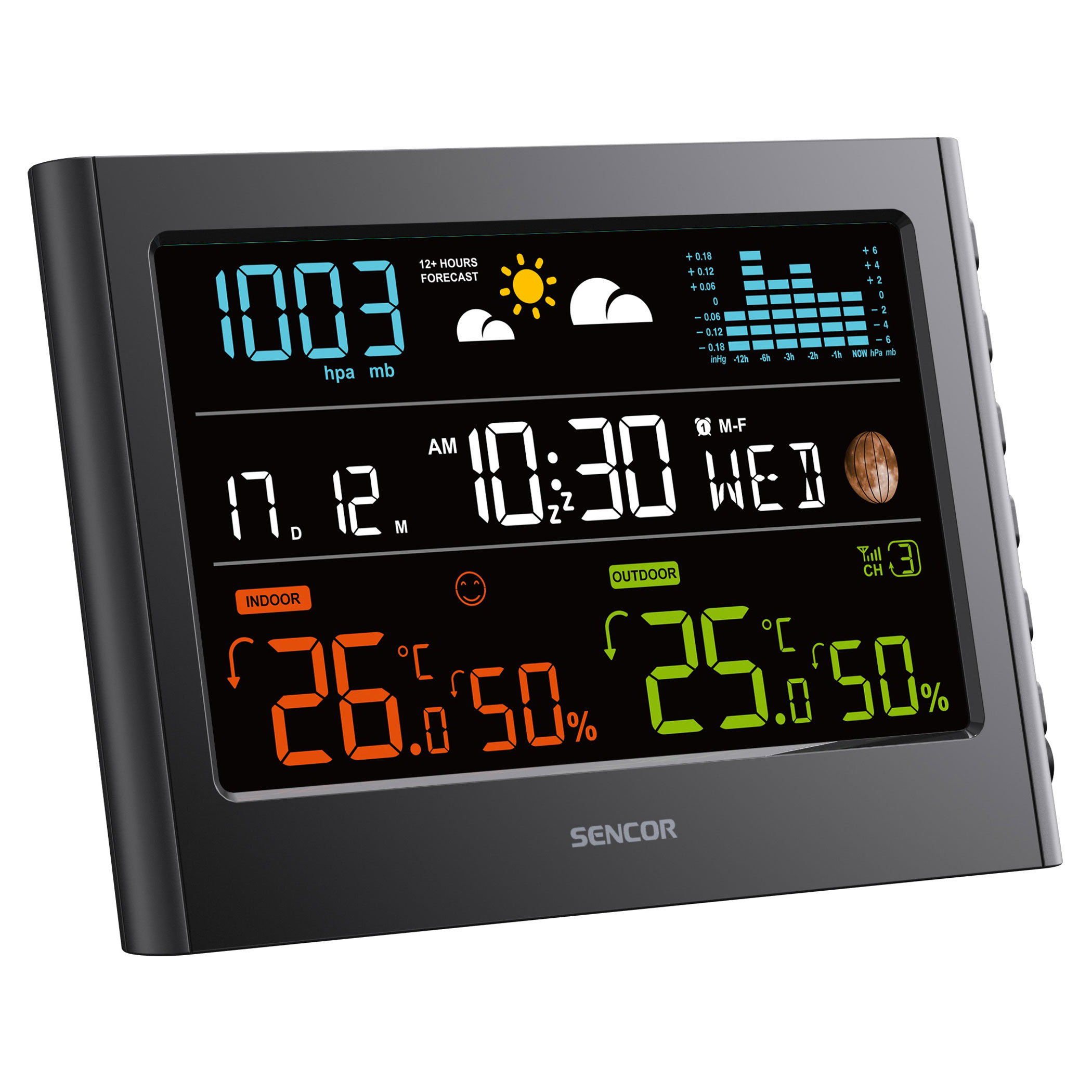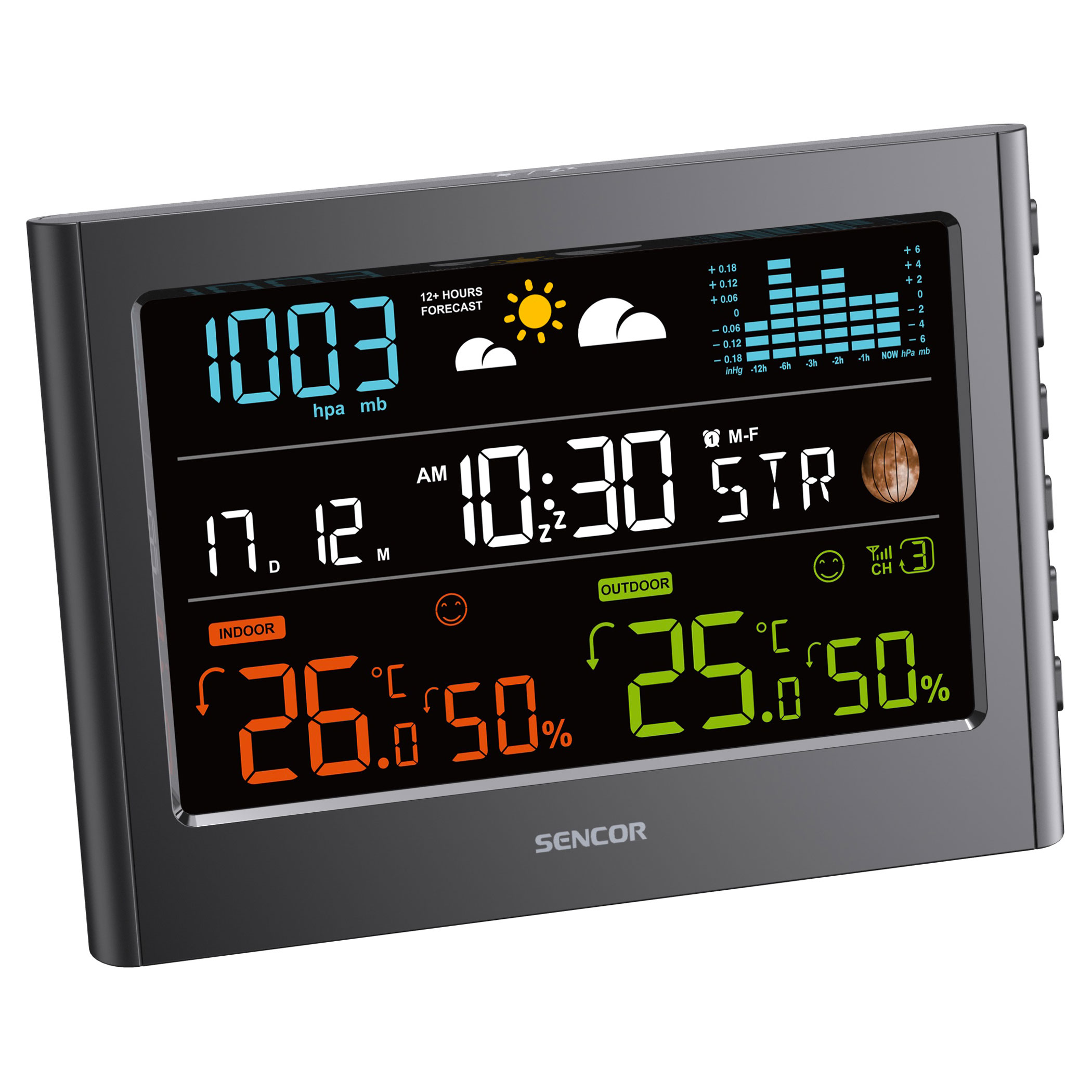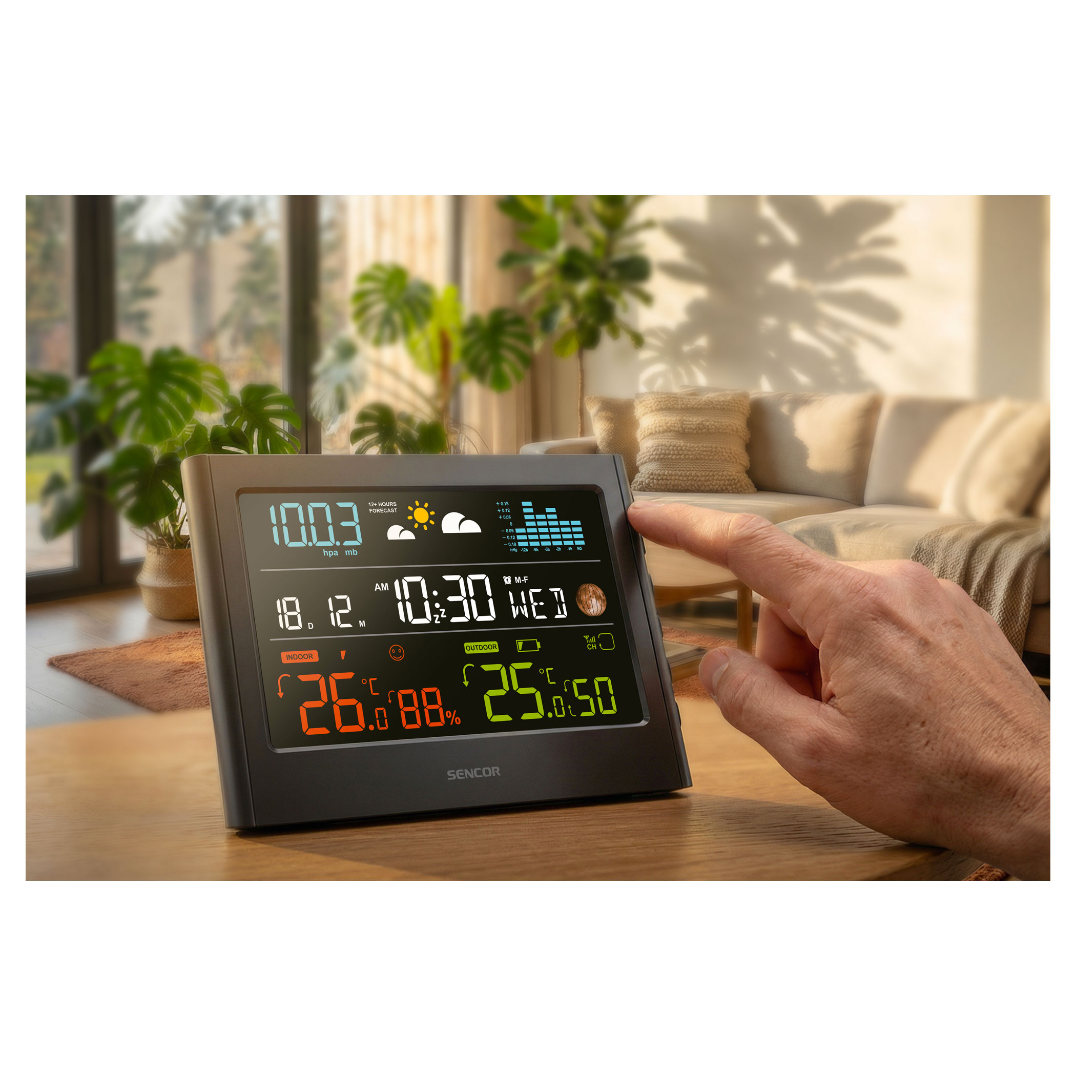 A beépített barométer megjeleníti az aktuális légnyomást, valamint az elmúlt órák nyomásváltozását oszlopdiagramon (-1, -2, -3, -6, -12 óra). A légnyomás trendje segít előre jelezni az időjárás változását.