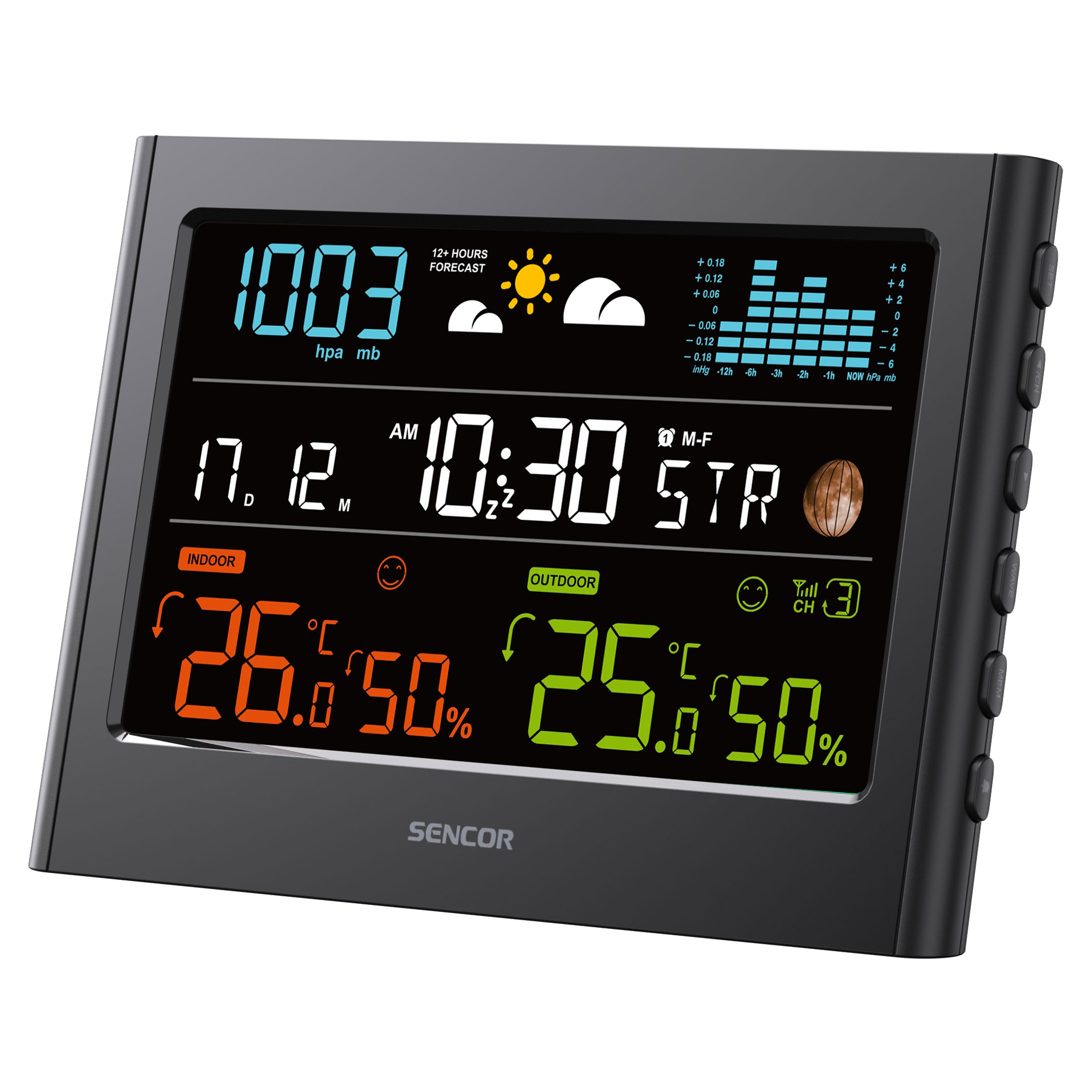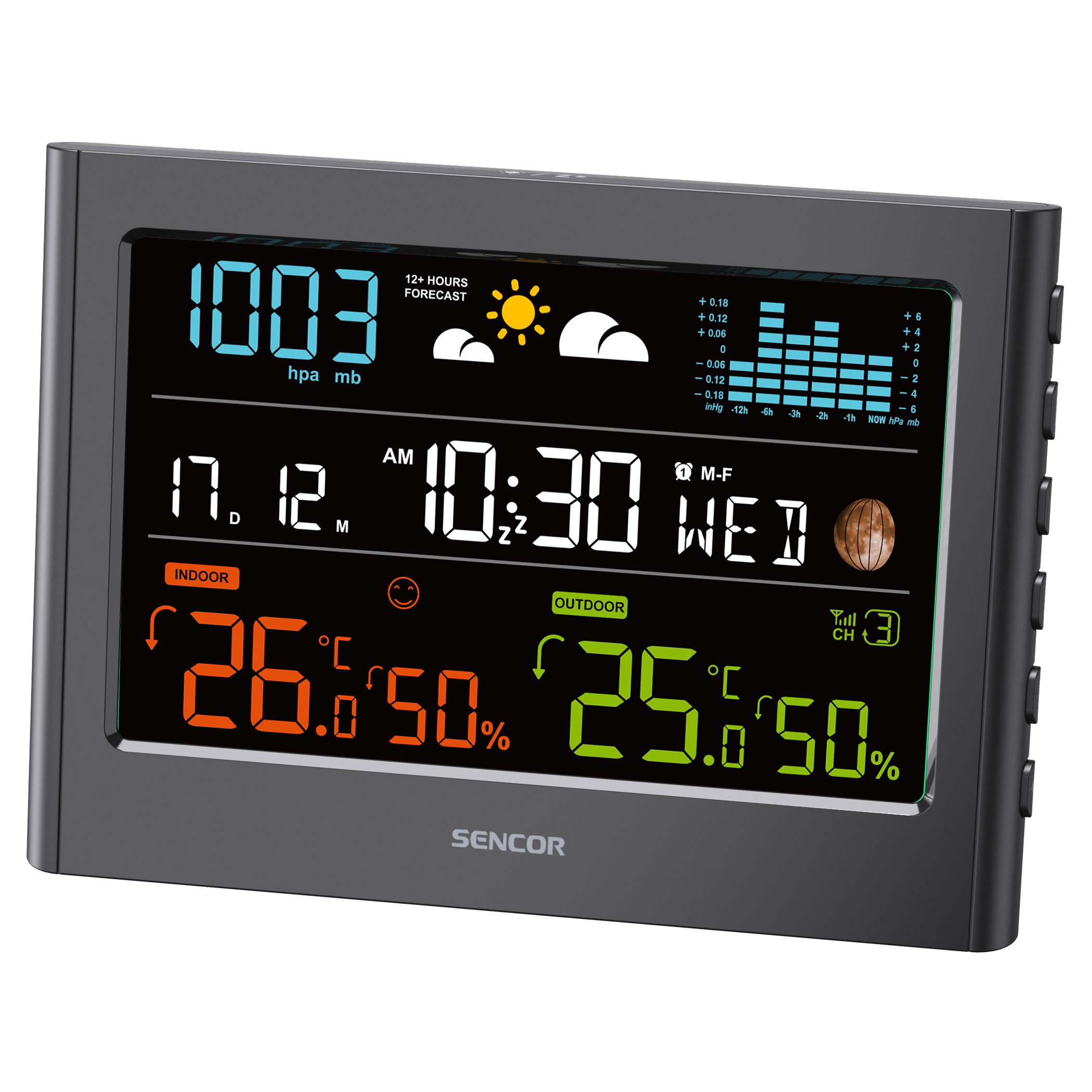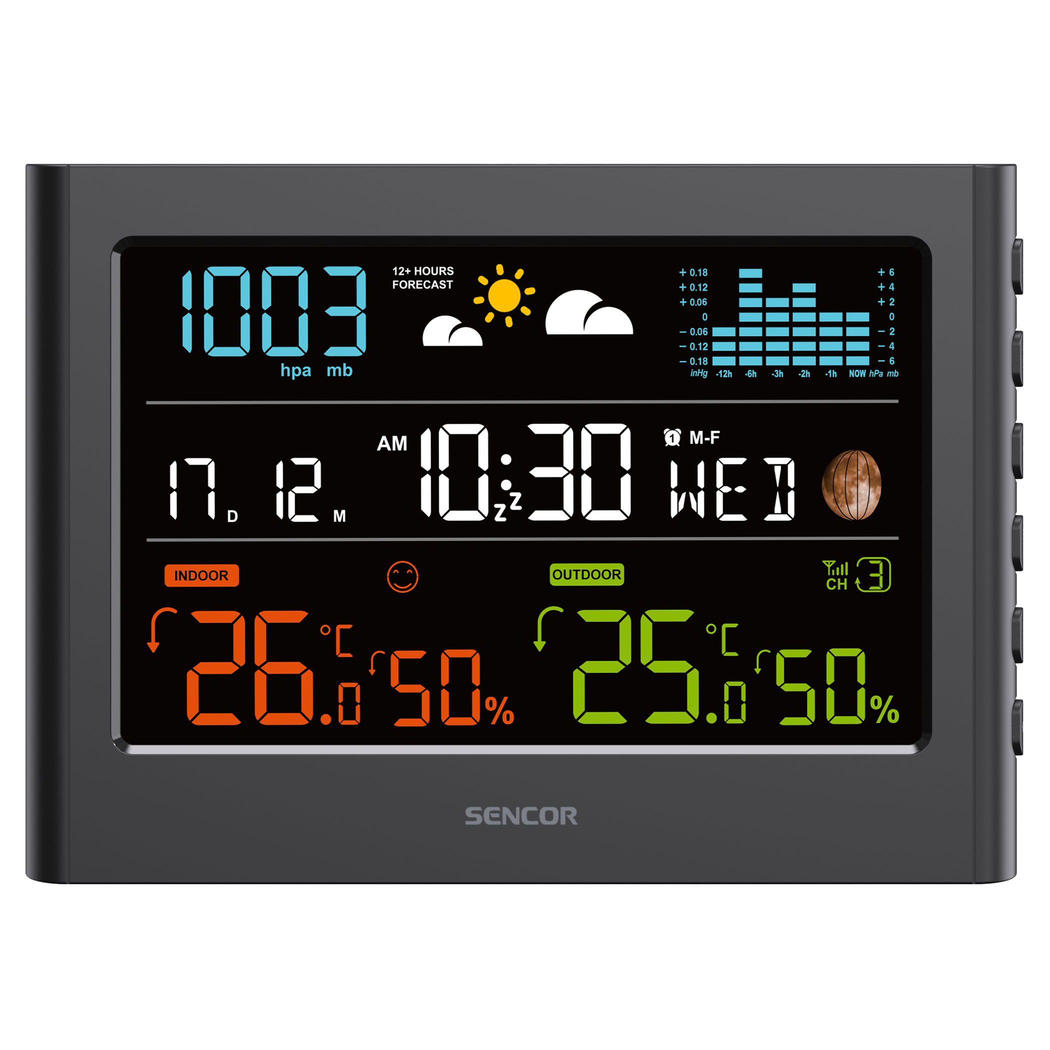 A beépített barométer megjeleníti az aktuális légnyomást, valamint az elmúlt órák nyomásváltozását oszlopdiagramon (-1, -2, -3, -6, -12 óra). A légnyomás trendje segít előre jelezni az időjárás változását.