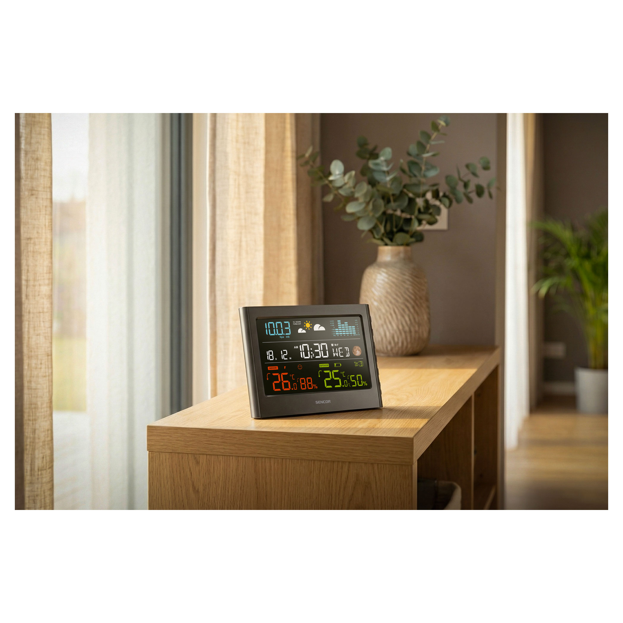 Az áttekinthető kijelzőn minden fontos adat megjelenik: belső és külső hőmérséklet Celsius/Fahrenheit fokban, valamint páratartalom százalékban. Holdfázisok, napkelte és napnyugta időpontok, valamint fagy- és extrém hőmérséklet riasztások is rendelkezésre állnak.