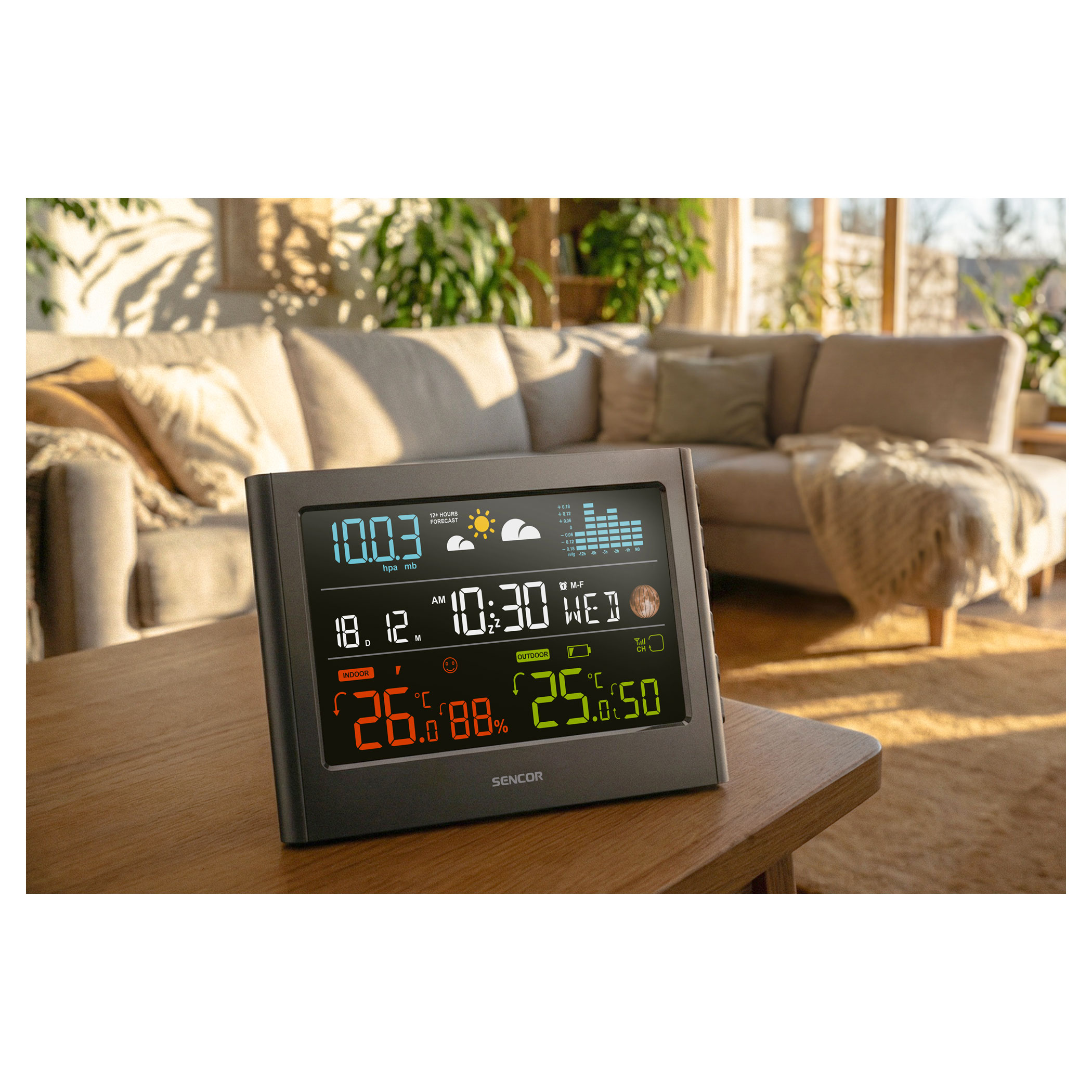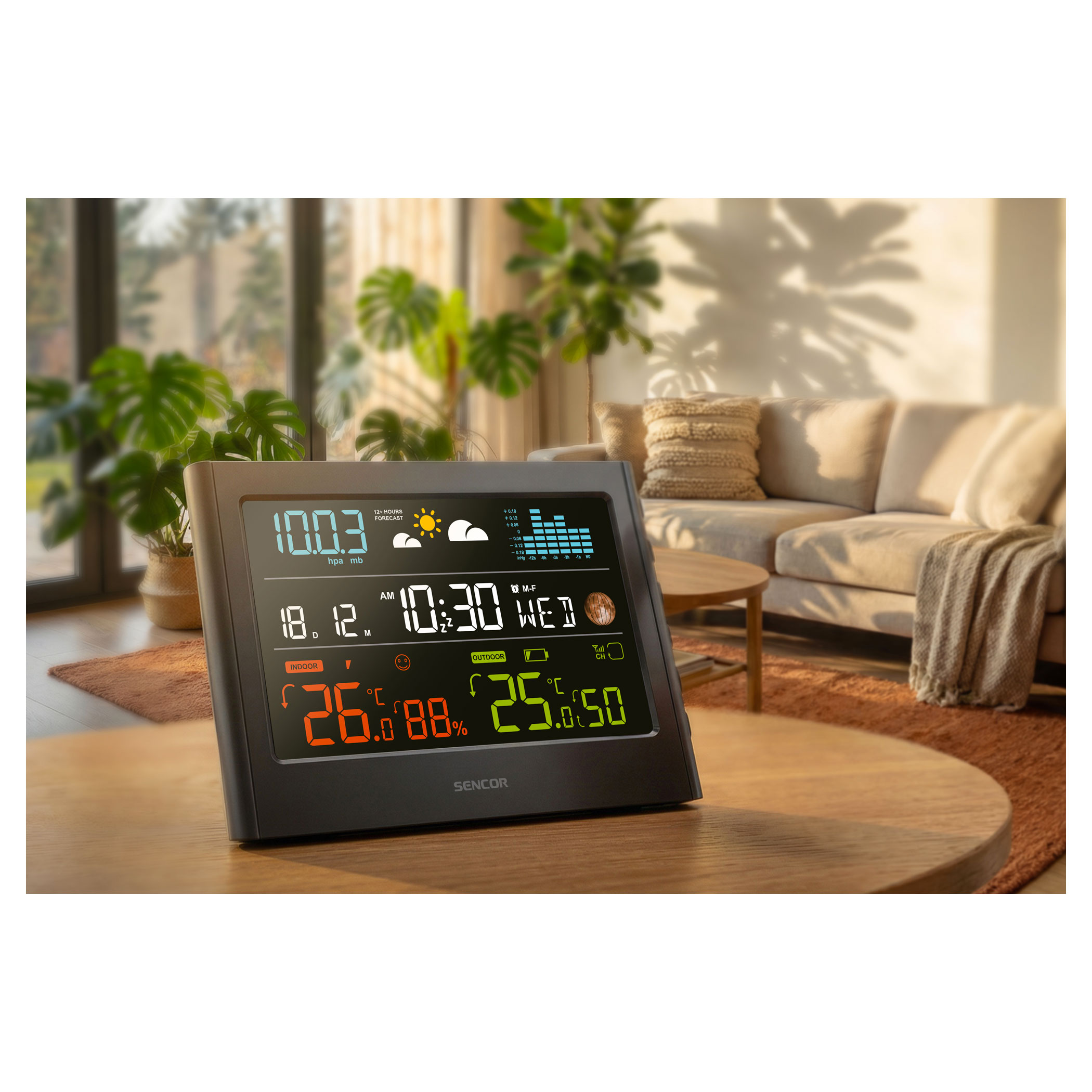 Az állomás a légnyomás és a hőmérséklet változásait elemzi, és 12–24 órás előrejelzést nyújt. Az áttekinthető ikonok jelzik a napos, enyhén felhős, felhős, esős és havas időjárást. Kövesse a belső és külső hőmérsékletet és páratartalmat trendjelzőkkel.