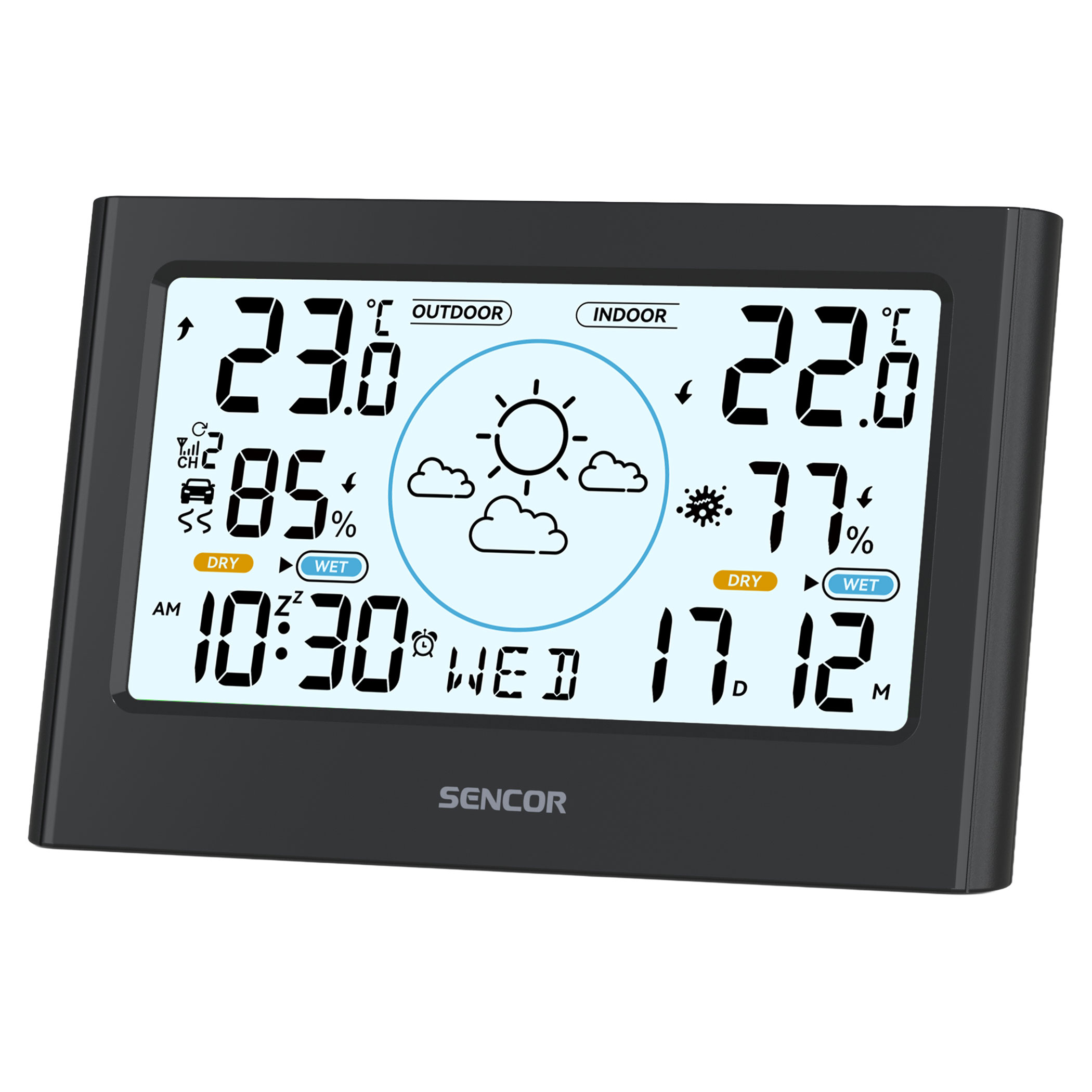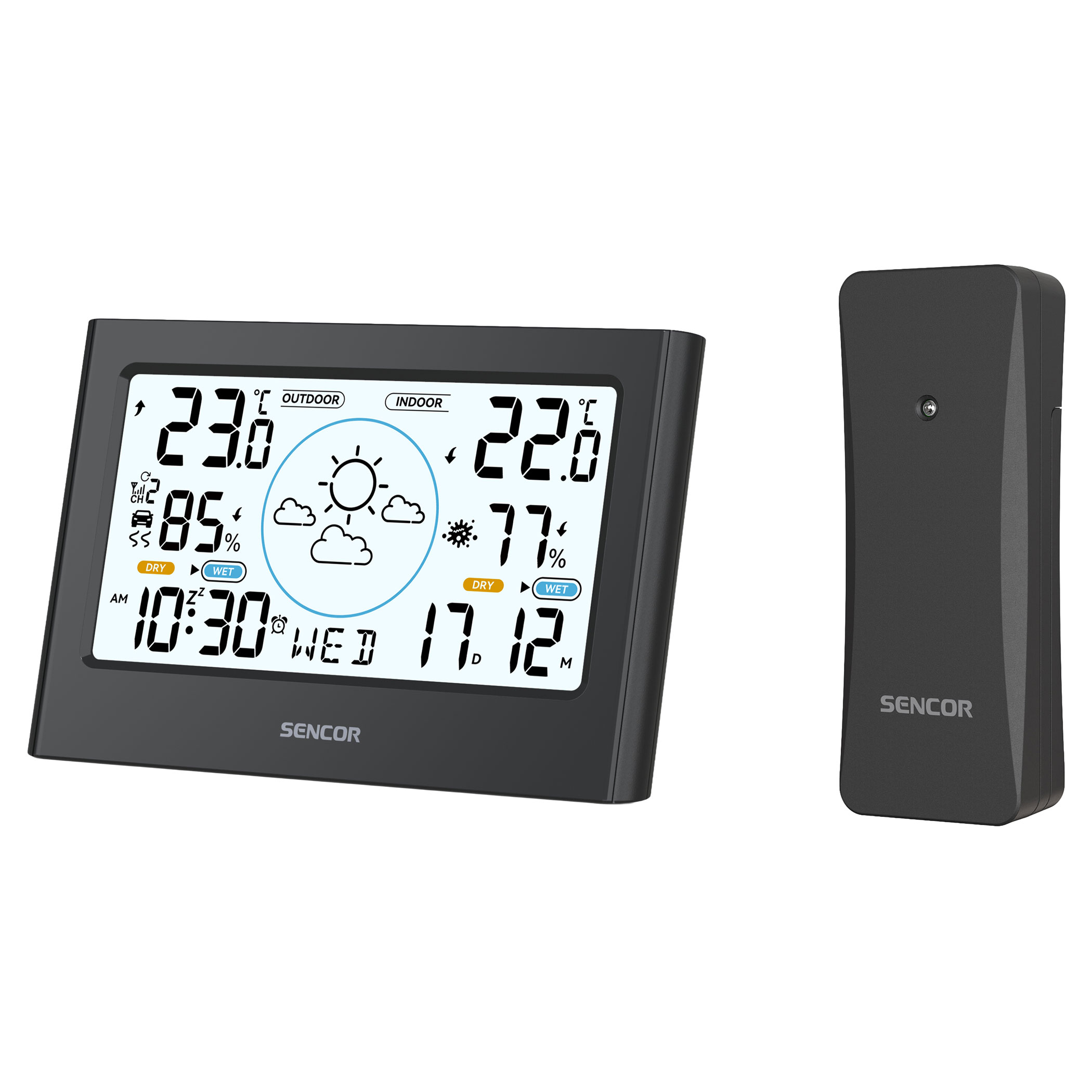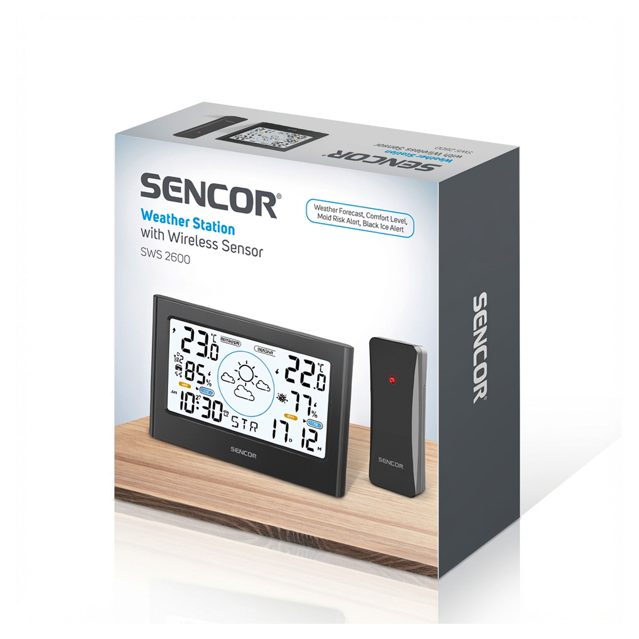 A Sencor SWS 2600 meteorológiai állomás a vezeték nélküli érzékelőnek köszönhetően pontosan méri a hőmérsékletet és a páratartalmat. Figyelmeztet a jegesedésre, a penészkockázatra, és megjeleníti a komfortszintet is.