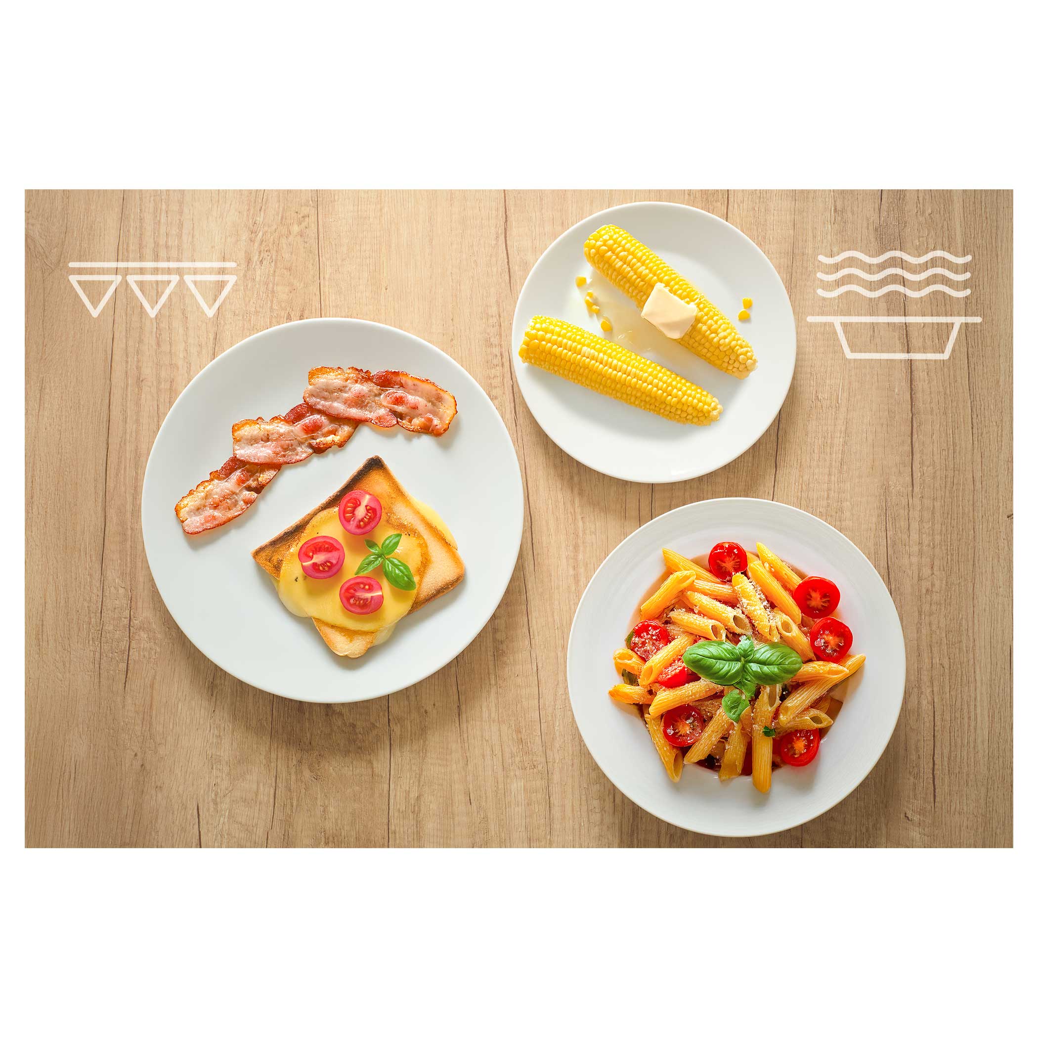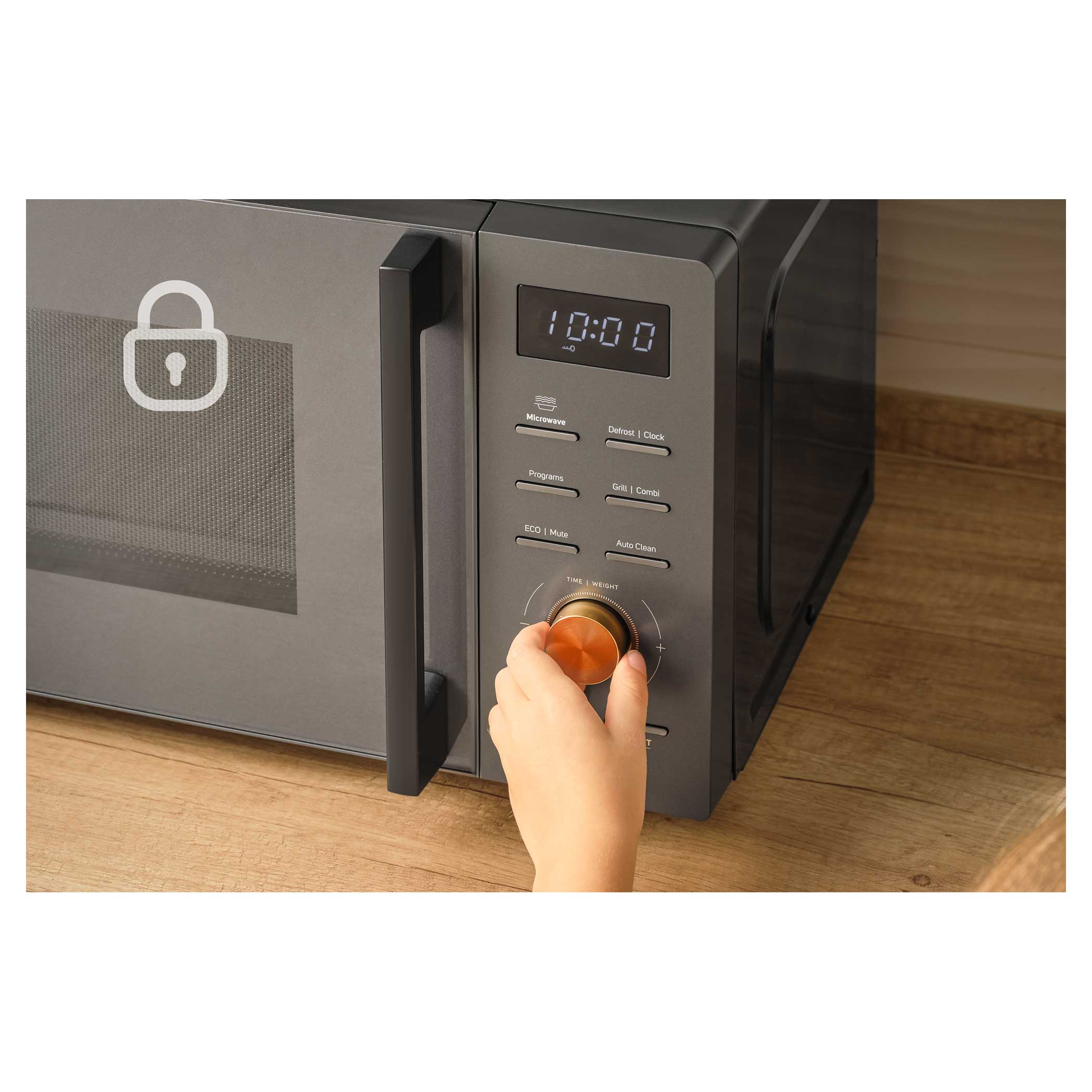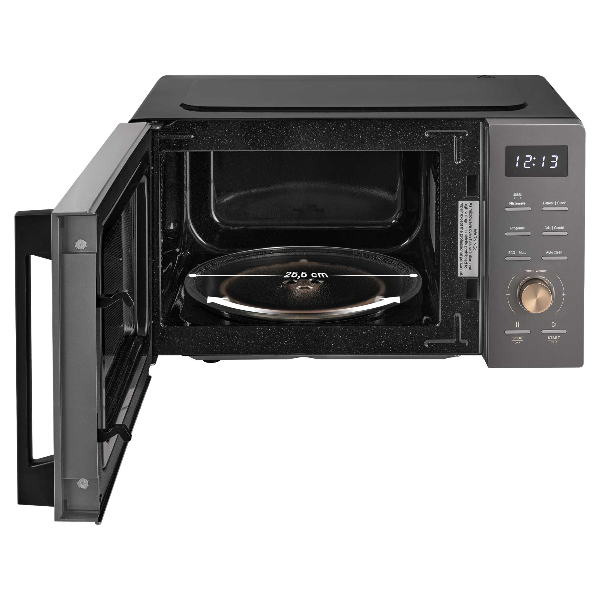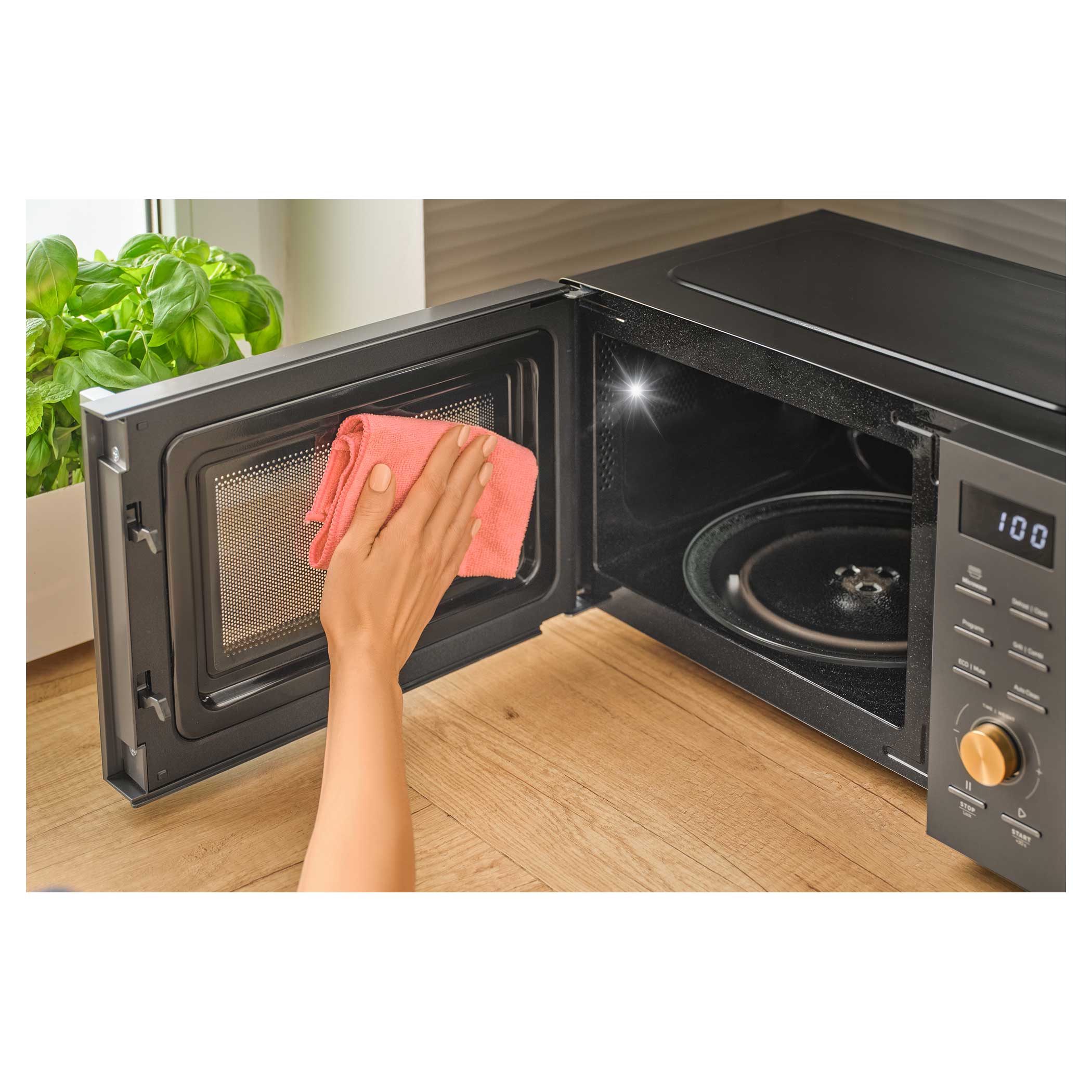 A gyermekbiztonsági zár gondoskodik a kicsik biztonságáról, a MUTE funkció pedig lehetővé teszi a hangjelzés kikapcsolását. A 25,5 cm átmérőjű forgótányér és a mellékelt grillrács biztosítják az egyenletes főzést és grillezést. A belső tér kerámiához hasonló felületi bevonattal rendelkezik, ami növeli a karcállóságot és megkönnyíti a tisztítást. Az Auto Clean funkció pedig még egyszerűbbé teszi a készülék karbantartását.