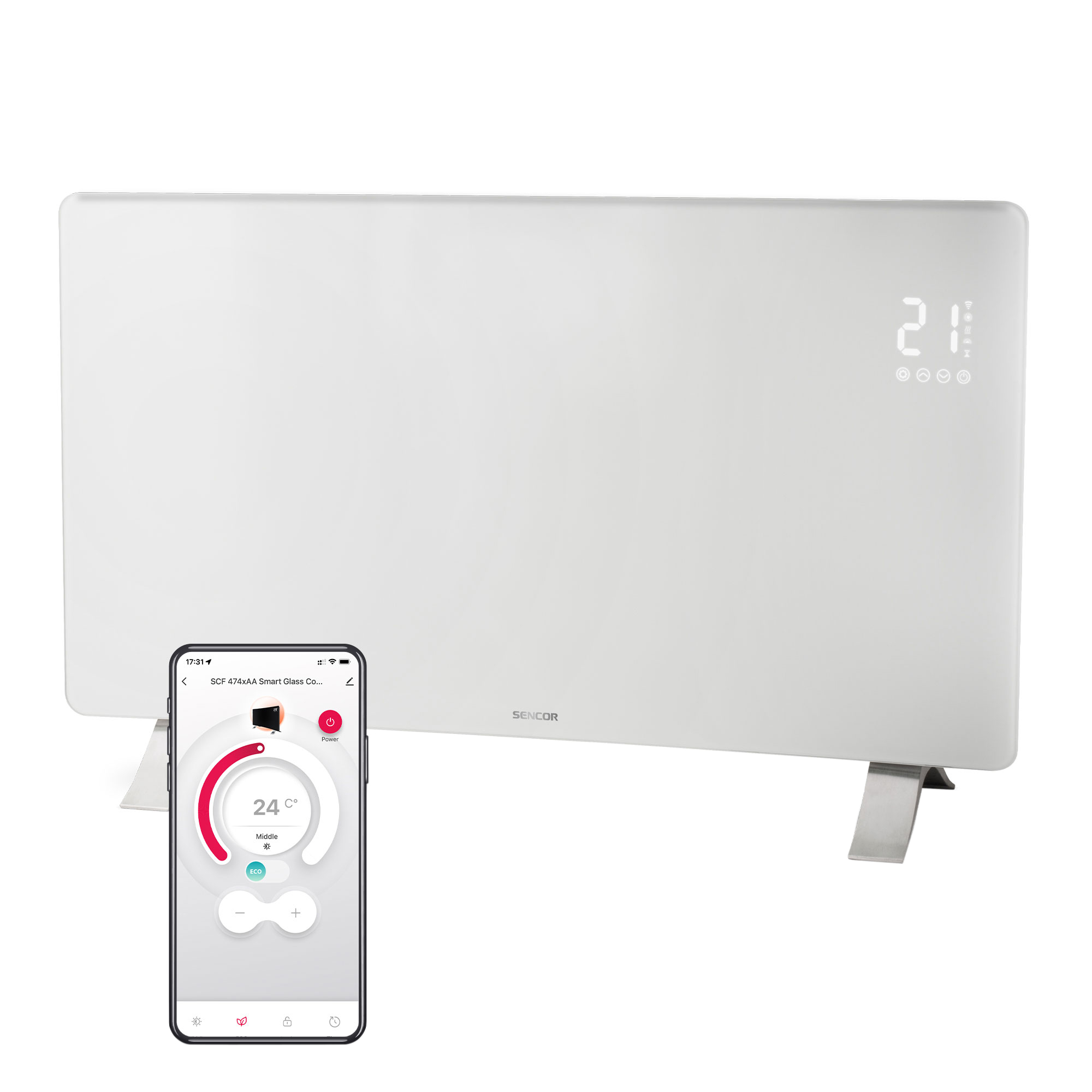 A Sencor SCF 4740WH egy elektromos üveg hősugárzó, amely digitális vezérlési lehetőséggel rendelkezik, és akár 2400 W maximális teljesítményt biztosít. Ez az okoseszköz Wi-Fi-n keresztül vezérelhető a Sencor HOME alkalmazás és okostelefon segítségével. A készülék szabadon elhelyezhető a szobában, de akár falra is szerelhető. Az üvegből készült előlap nemcsak esztétikusan, hanem praktikus módon is kiemeli a konvektor modern megjelenését. Az előlapján LED-es háttérvilágítással ellátott érintős vezérlés található, amely a helyiség pillanatnyi hőmérsékletét is megjeleníti. A hőmérsékletet széles tartományban, 5-45 °C között szabályozhatod, így mindig az ideális meleget érheted el. A készülék teljesíti a legszigorúbb nemzetközi követelményeket, és az IP24 szabványnak köszönhetően akár fürdőszobai használatra is alkalmas.