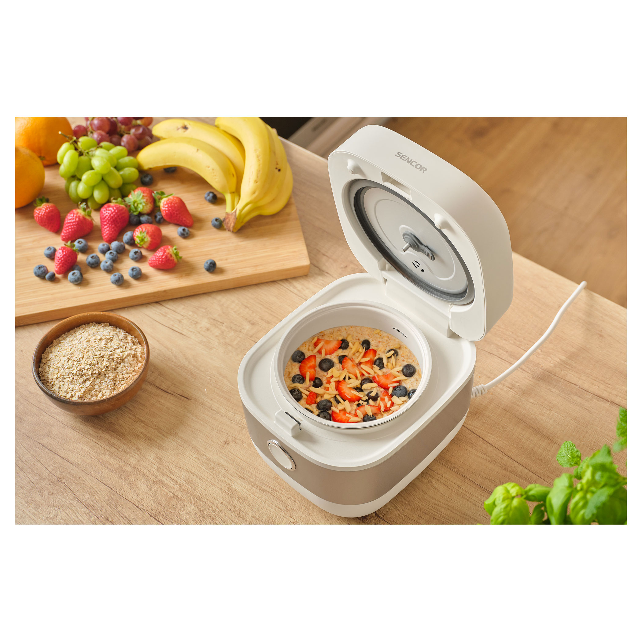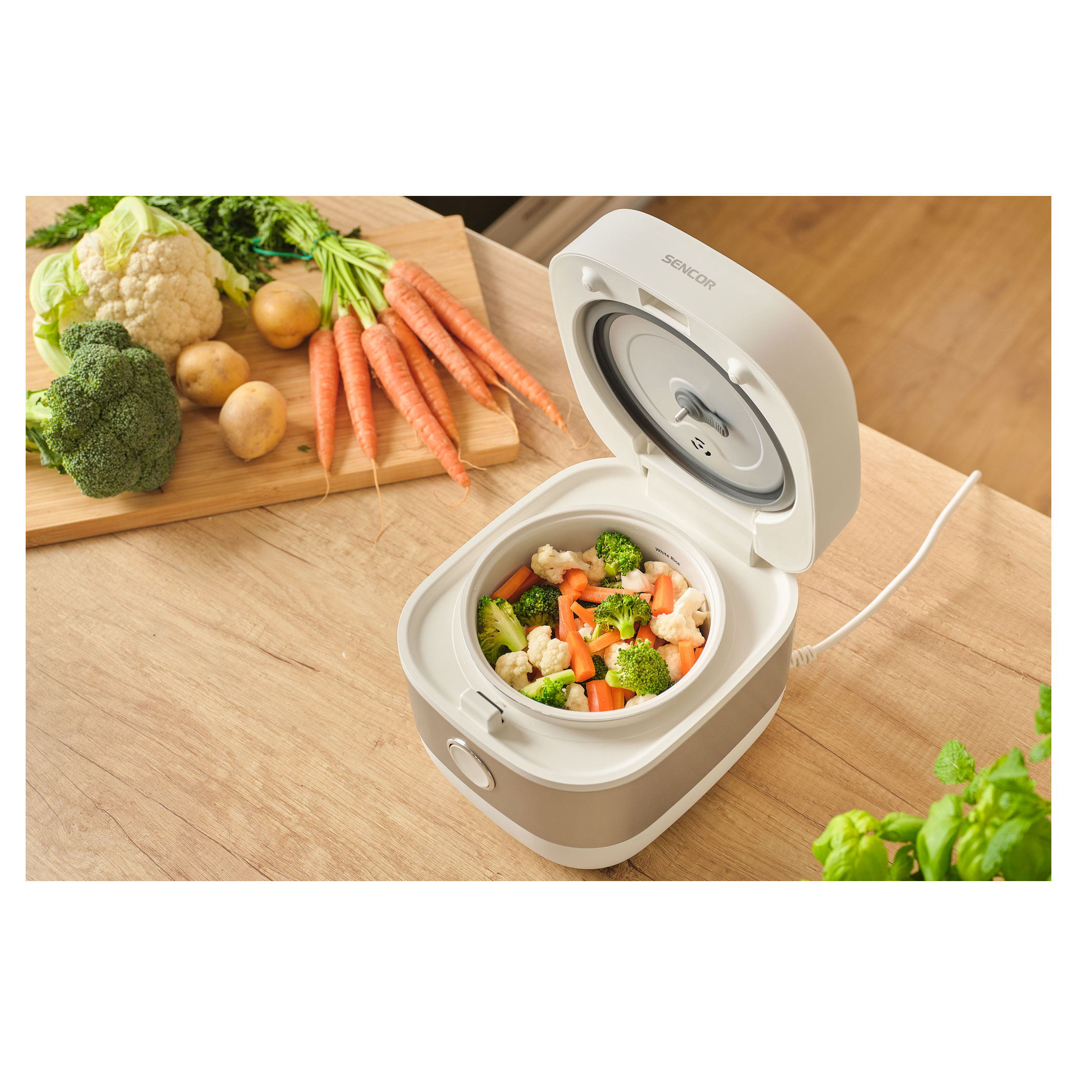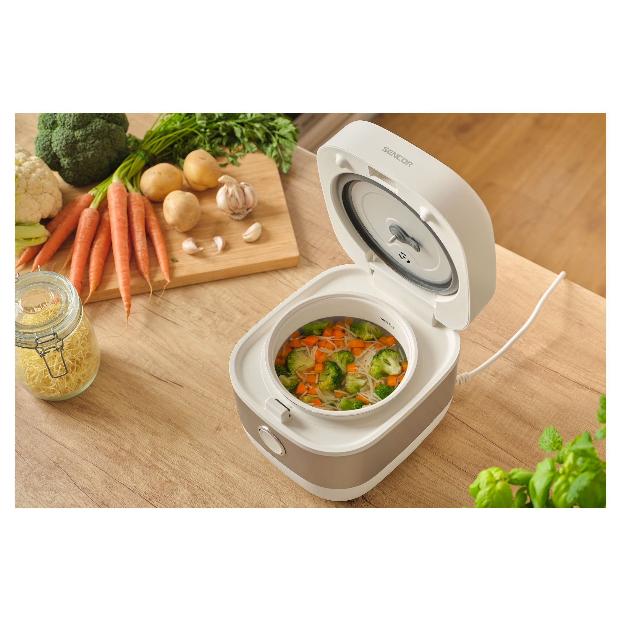 A Sencor SRM 1600WH rizsfőző ideális megoldás különféle rizsek, kásák, levesek és egyéb ételek kényelmes elkészítéséhez. A kerámia bevonatú alumínium belső edény 1,6 l űrtartalommal ideális a mindennapi otthoni főzéshez. Az áttekinthető digitális kijelzőnek és a 6 előre beállított programnak köszönhetően a használat egyszerű és intuitív.