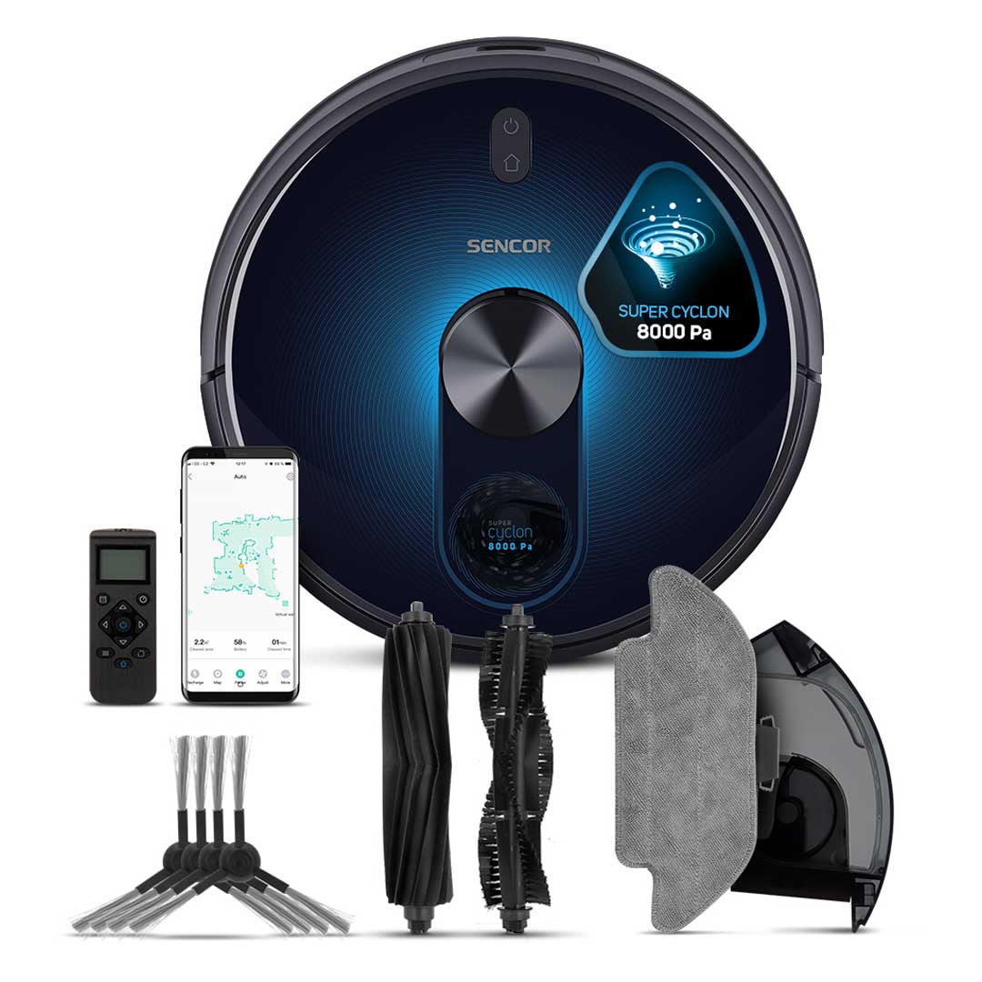 A Sencor SRV 9550BK robotporszívó ideális választás szőnyeg, fapadló, parketta, linóleum, padló csempe tisztítására. Segítségével a takarítás gyors és egyszerű, akár Wifi keresztül a munkahelyéről is elindíthatja. Lehetőség van időzítéses takarítás beállítására is. Két szélső forgókefével lett felszerelve, így a sarkokat is tökéletesen tisztítja. A beépített állítható érzékelőknek köszönhetően, egyszerűen megelőzhető a lépcsőről való leesés vagy a bútorokkal történő ütközés. A kerekek elakadása esetén automatikusan kikapcsolja önmagát és hiba üzenetet küld a felhasználó számára. A működését egy 6200 mAh Li-Ion akkumulátor biztosítja, amellyel a porszívó akár 200 percig is üzemeltethető egyetlen töltéssel.