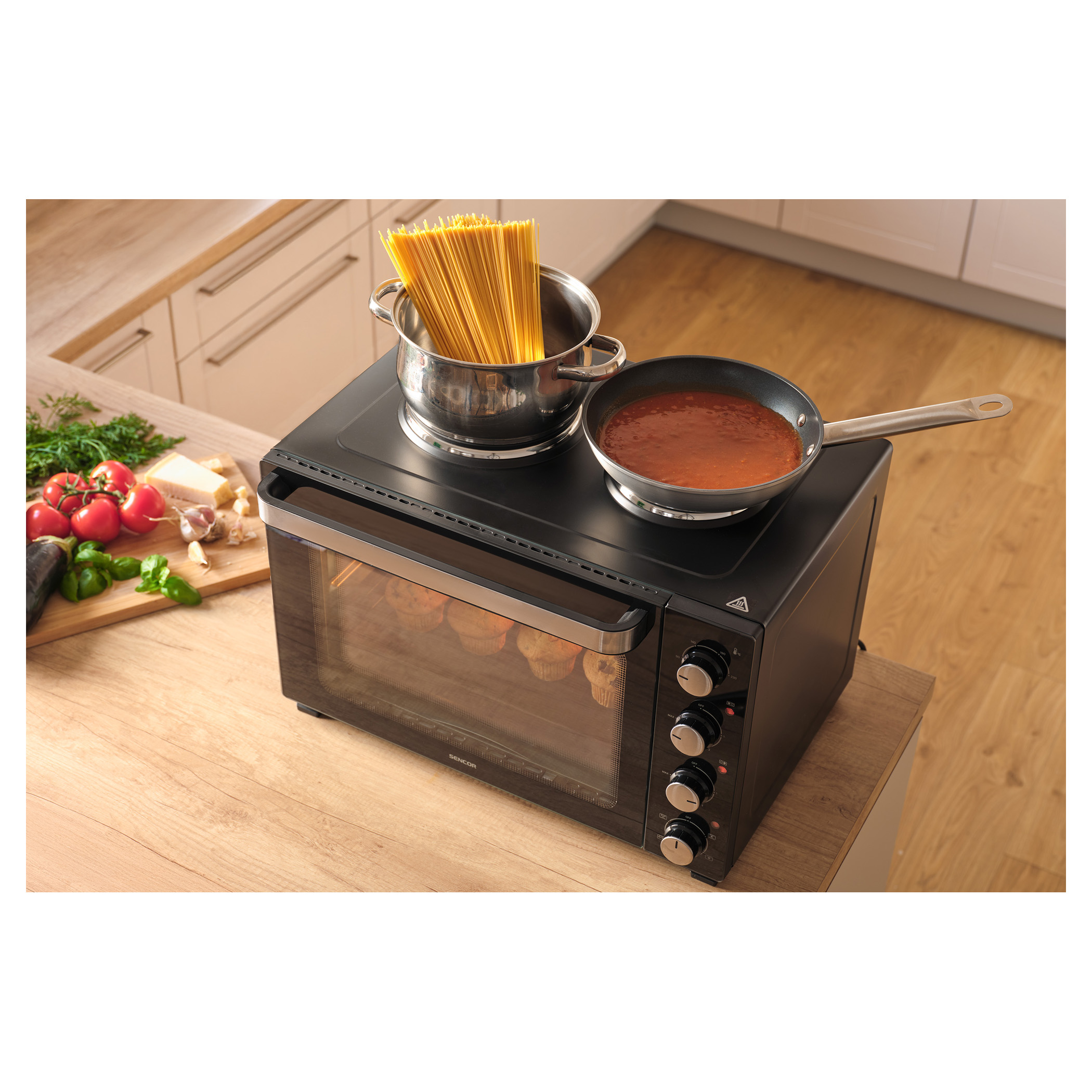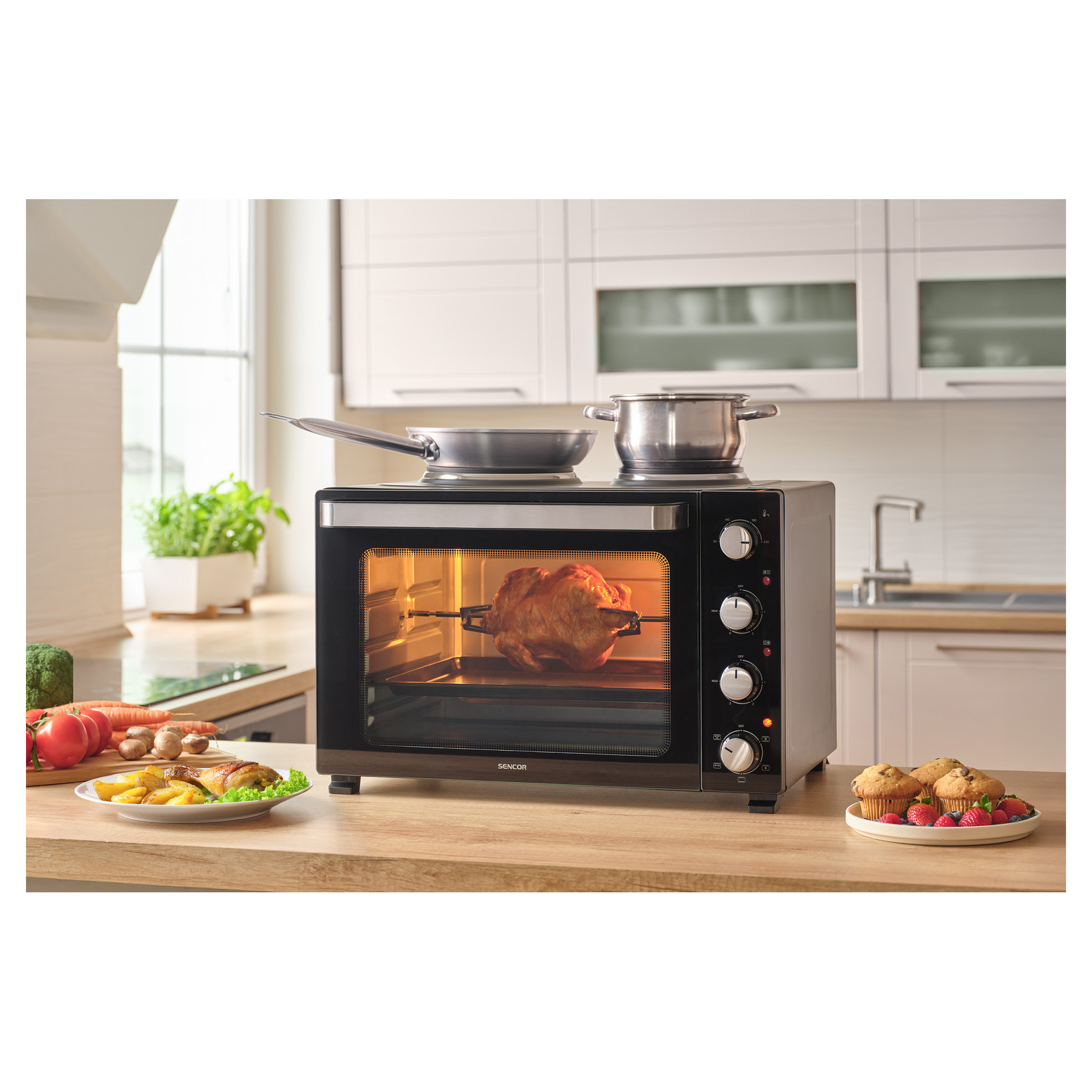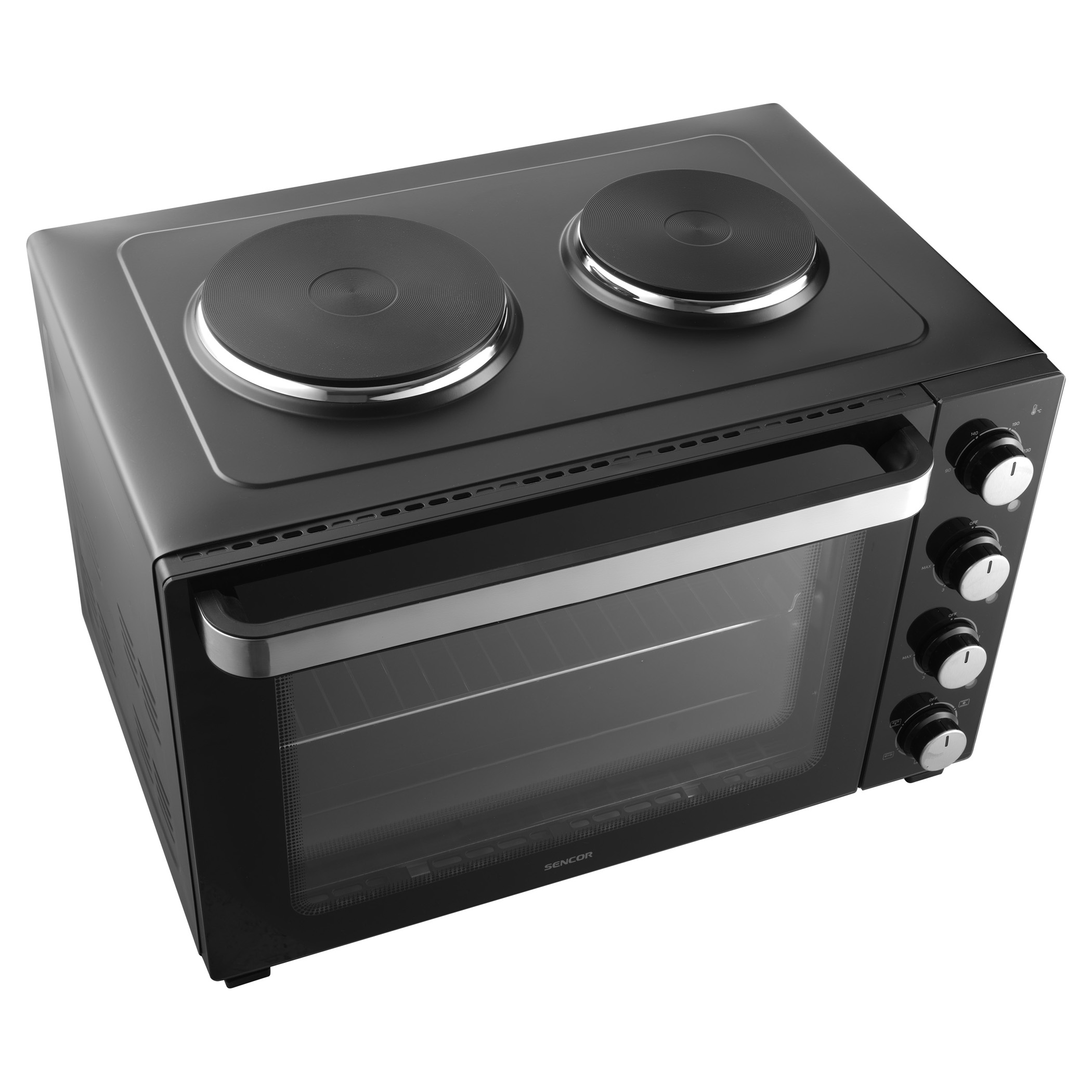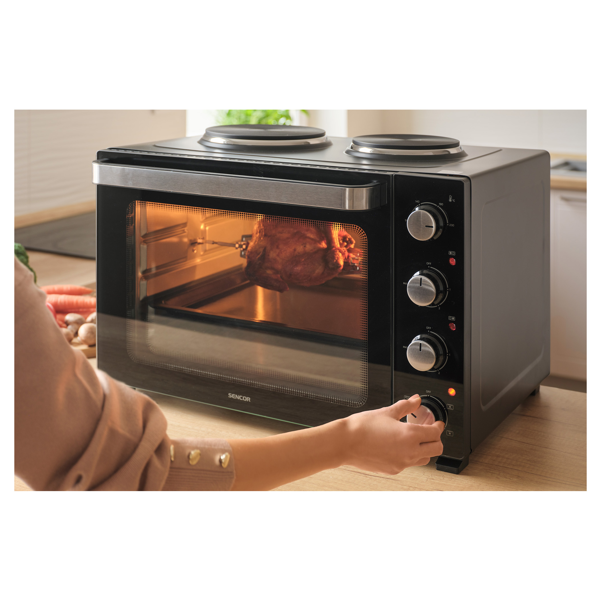 A Sencor SEO 4800BK elektromos sütő főzőlapokkal könnyedén megbirkózik levesek főzésével, szószok készítésével, tésztaételek sütésével és akár egy egész csirke megsütésével is, a 3 500 W összteljesítménynek és a 48 literes űrtartalomnak köszönhetően. A kényelmes beállítást 4 forgatógomb teszi lehetővé. A főzőlapok és a sütő aktuális működését 3 különálló jelzőlámpa mutatja.