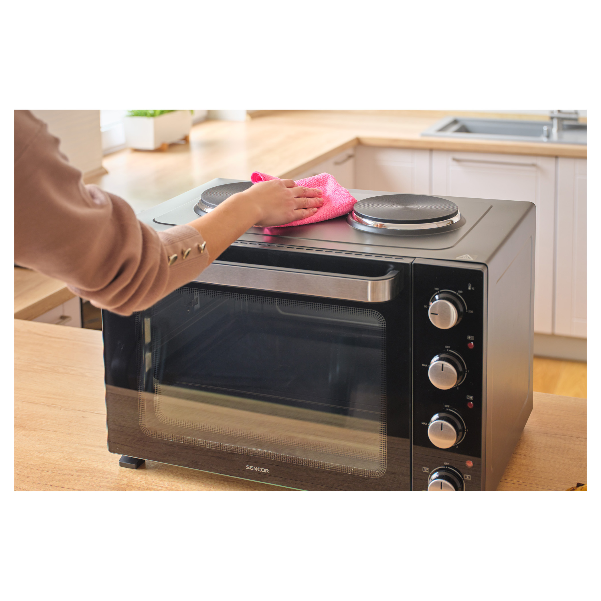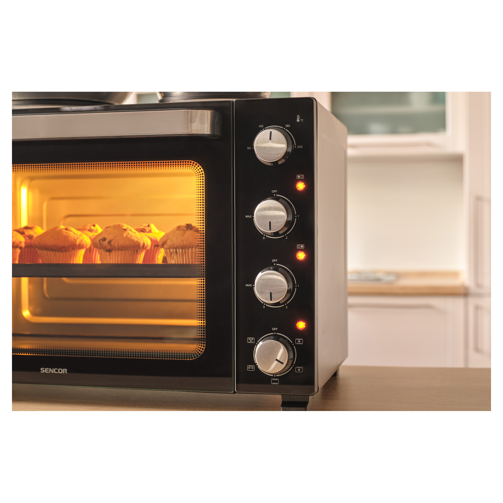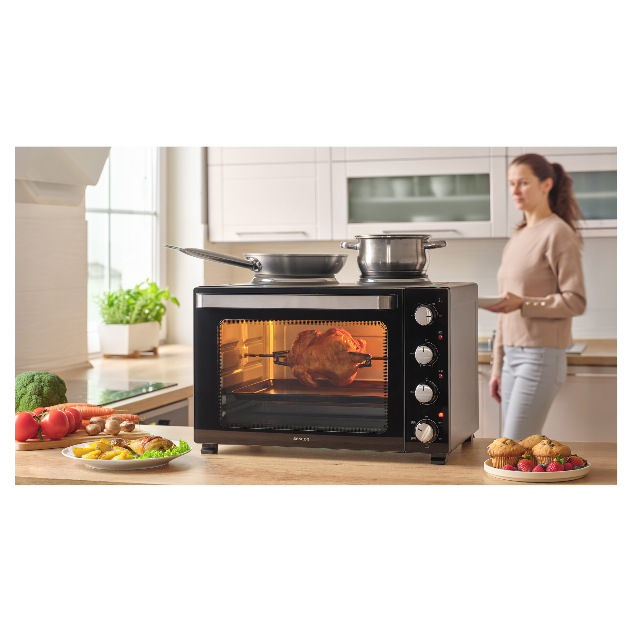 A Sencor SEO 4800BK elektromos sütő főzőlapokkal könnyedén megbirkózik levesek főzésével, szószok készítésével, tésztaételek sütésével és akár egy egész csirke megsütésével is, a 3 500 W összteljesítménynek és a 48 literes űrtartalomnak köszönhetően. A kényelmes beállítást 4 forgatógomb teszi lehetővé. A főzőlapok és a sütő aktuális működését 3 különálló jelzőlámpa mutatja.