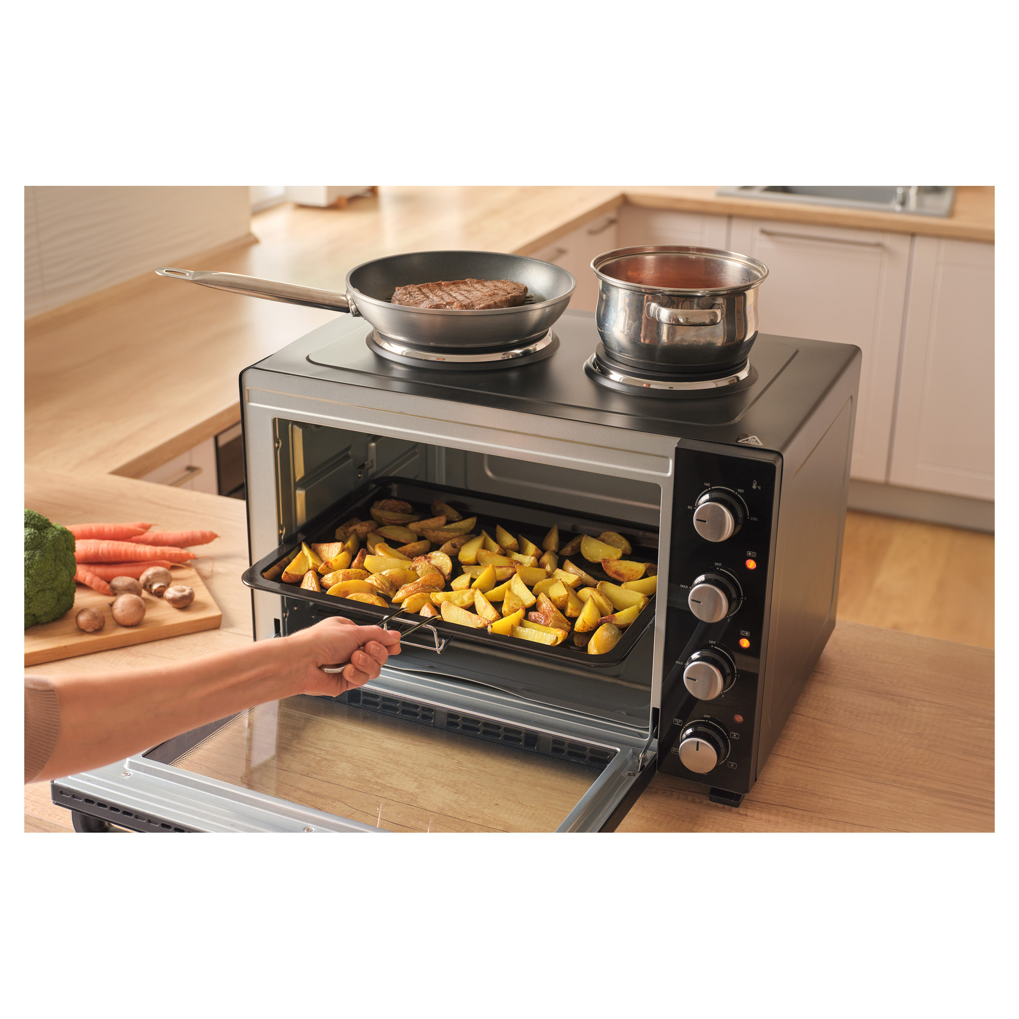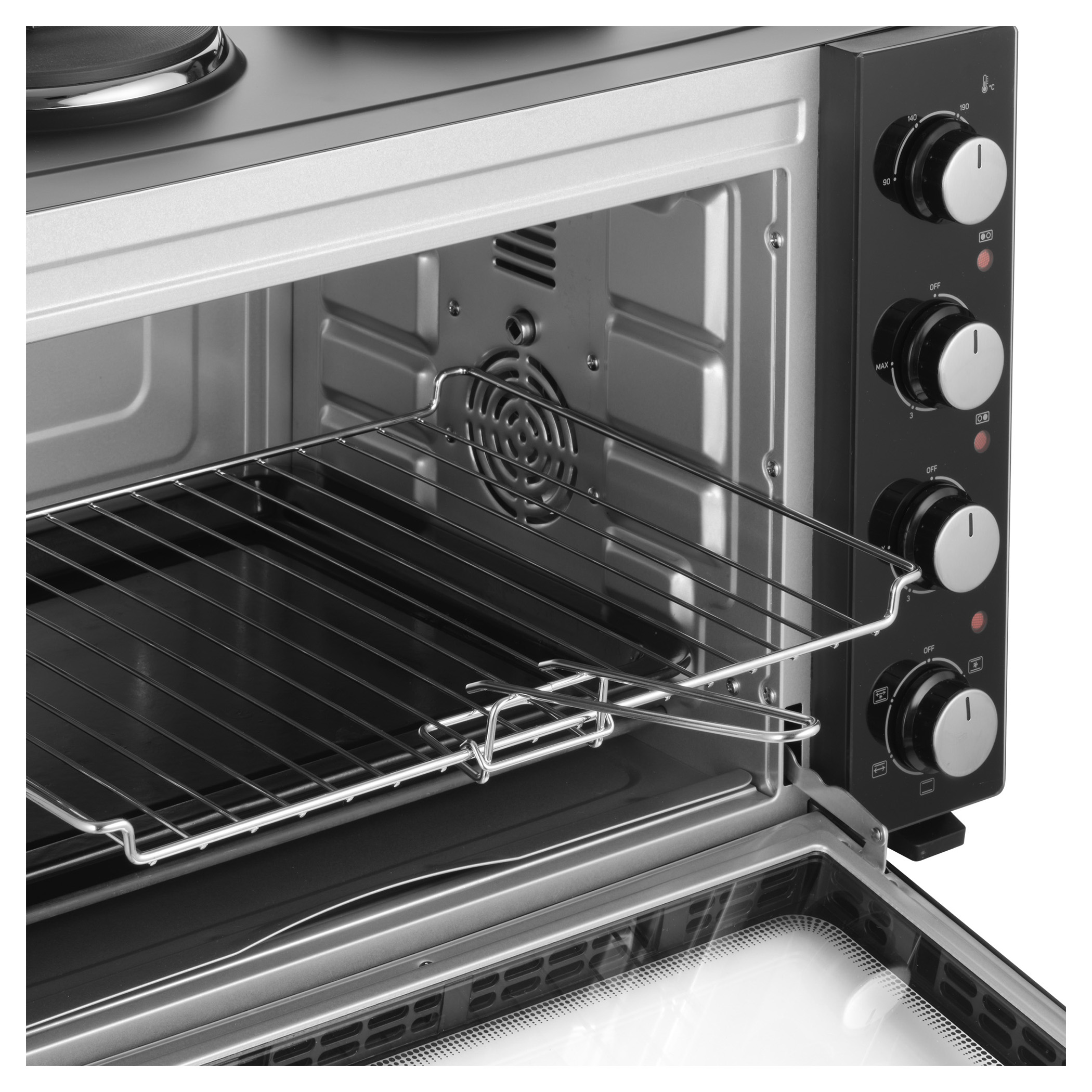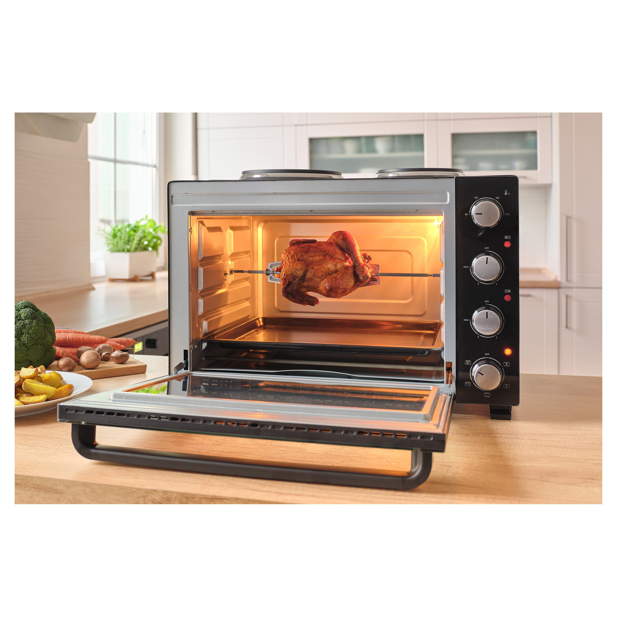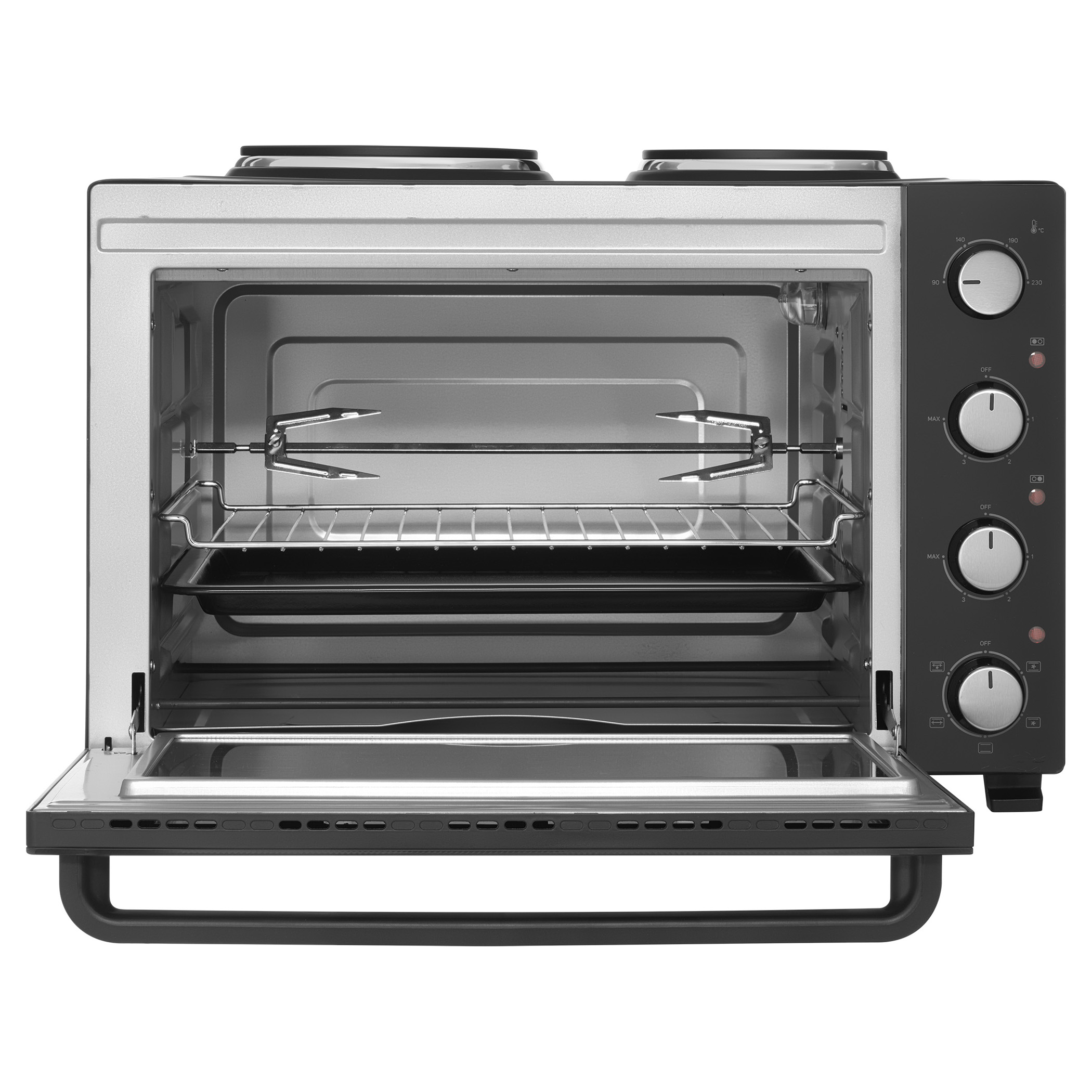 A Sencor SEO 4800BK elektromos sütő főzőlapokkal könnyedén megbirkózik levesek főzésével, szószok készítésével, tésztaételek sütésével és akár egy egész csirke megsütésével is, a 3 500 W összteljesítménynek és a 48 literes űrtartalomnak köszönhetően. A kényelmes beállítást 4 forgatógomb teszi lehetővé. A főzőlapok és a sütő aktuális működését 3 különálló jelzőlámpa mutatja.