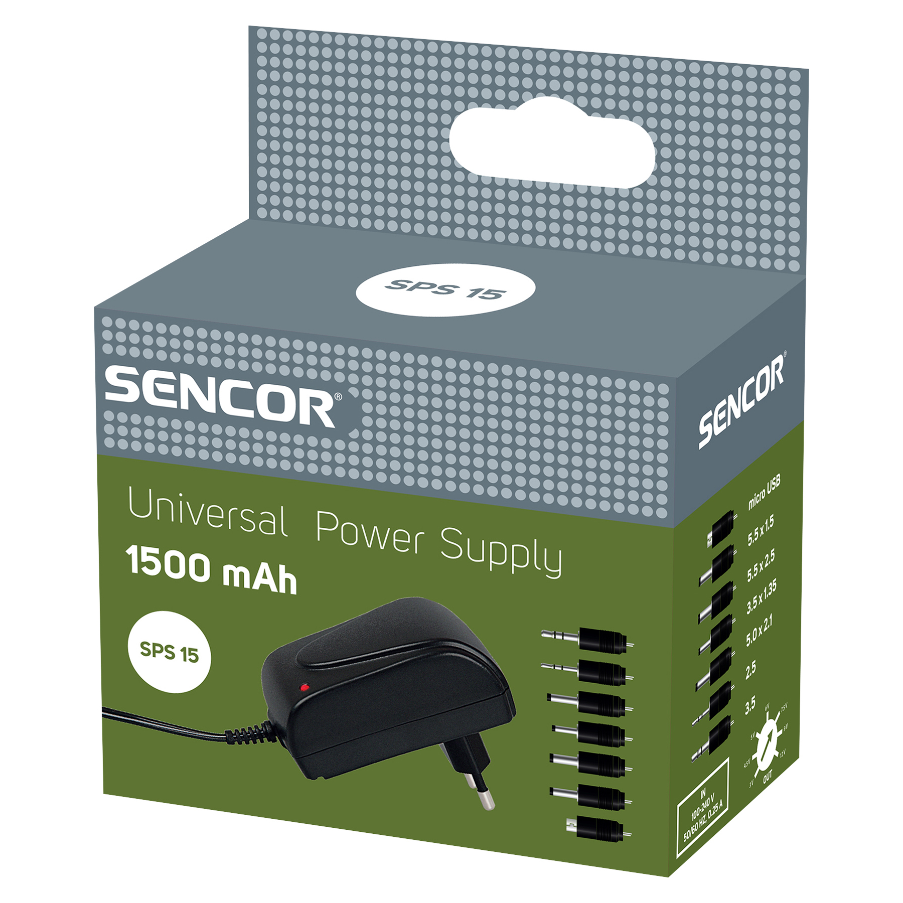 A Sencor SPS 15 egy univerzális hálózati tápegység 1500 mAh töltési lehetőséggel. Megfelel a legújabb EU-s ECO szabványoknak. Alacsony energia felvétel készenlét üzemmódban. Változtatható polaritással, rövidzárlat, túltöltés és túlmelegedés elleni védelemmel ellátva.