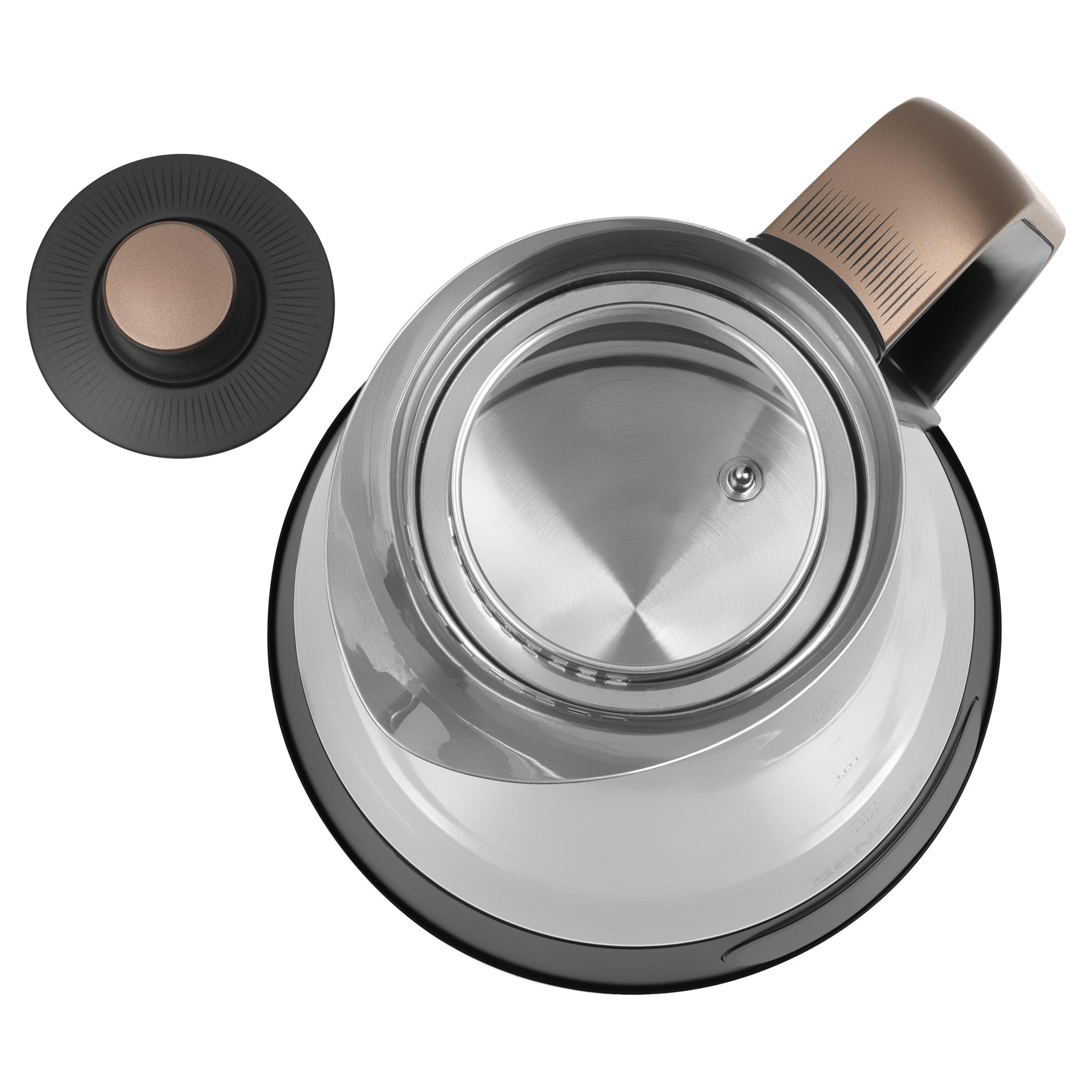Emeld magasabb szintre a tea- és kávéfogyasztási rituáléidat az SWK 1595BK üveg elektromos vízforralóval, amely változtatható hőmérsékletet biztosít – ahol a legmodernebb technológia találkozik az időtlen dizájnnal. A nagyméretű, 1,5 literes űrtartalommal és a 35°C és 100°C között változtatható hőmérséklet-szabályozással ez a vízforraló biztosítja, hogy minden főzet tökéletes legyen, akár finom zöld teát, akár robusztus French press kávét készítesz. A nagy teljesítményű, 2150 W-os fűtőszál gyorsan és hatékonyan melegíti a vizet a kívánt hőmérsékletre. A melegen tartó funkció fenntartja az ideális hőmérsékletet, míg a Start/Stop hangjelzés egy csipetnyi kényelmet visz a mindennapi rutinodba. A biztonság mindennél fontosabb, köszönhetően a dupla biztonsági rendszernek és a STRIX 360°-os központi csatlakozónak a zökkenőmentes, vezeték nélküli működés érdekében. A prémium boroszilikát üvegből készült és elegáns rozsdamentes acéllal díszített SWK 1595BK nem csupán egy konyhai készülék – hanem egy igazán mutatós darab.