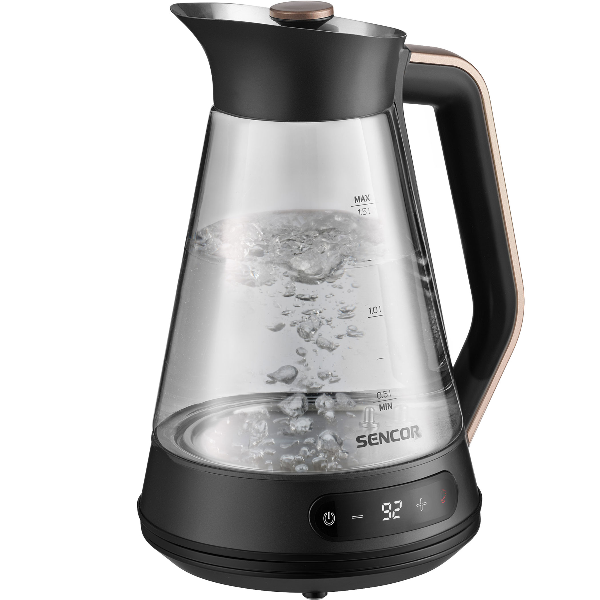 üveg elektromos vízforralóval, amely változtatható hőmérsékletet biztosít – ahol