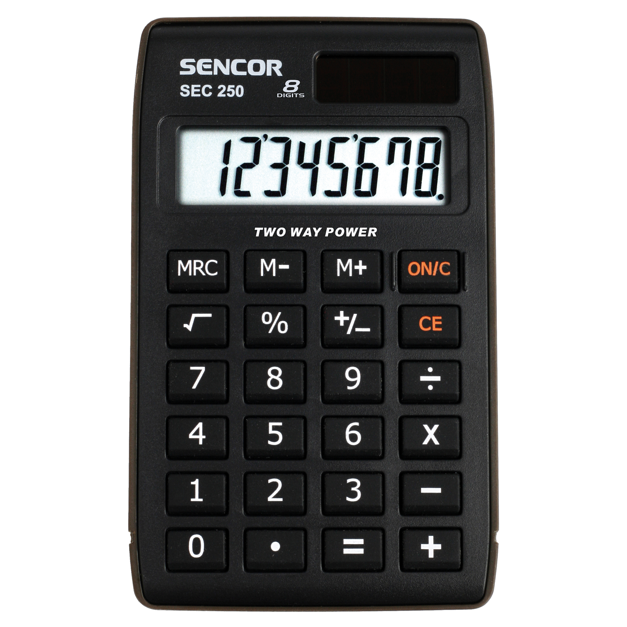 A Sencor SEC 250/8 praktikus zsebszámológép univerzális segédeszközként használható. Fő előnye a 8 számjegyű LCD kijelző, amely lehetővé teszi a kényelmes munkát és a számjegyek jó láthatóságát. A számológép változó jelekkel (+/-), négyzetgyök számítási lehetőséggel, háromgombos független memóriával, százalékszámítási funkciókkal, ezres helyiérték elválasztóval is rendelkezik. A kettős áramellátó rendszer (napelem és akkumulátor) biztosítja a megbízhatóságot az automata kikapcsolási funkció a hosszú élettartamot garantálja. A SEC 250/8 méretét tekintve 98 x 60 x 8 mm, amelyhez mindössze 50 g súly társul.